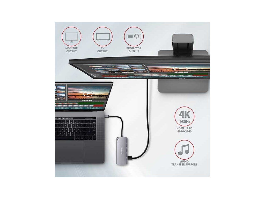 Výstup HDMI poskytuje vysokokvalitné video s rozlíšením až 4K/30 Hz Ultra HD a podporuje viackanálový prenos zvuku. Aby video výstup fungoval správne, notebook musí mať port USB-C s podporou alternatívneho režimu DisplayPort (DP Alt Mode) alebo port Thunderbolt 3.