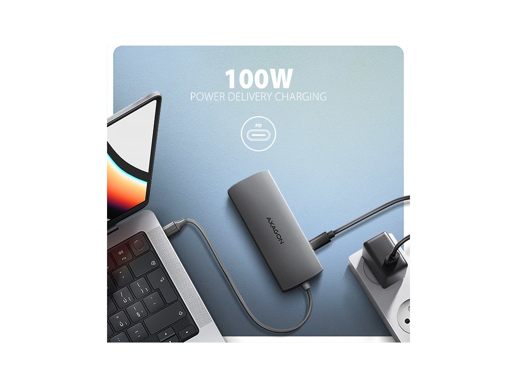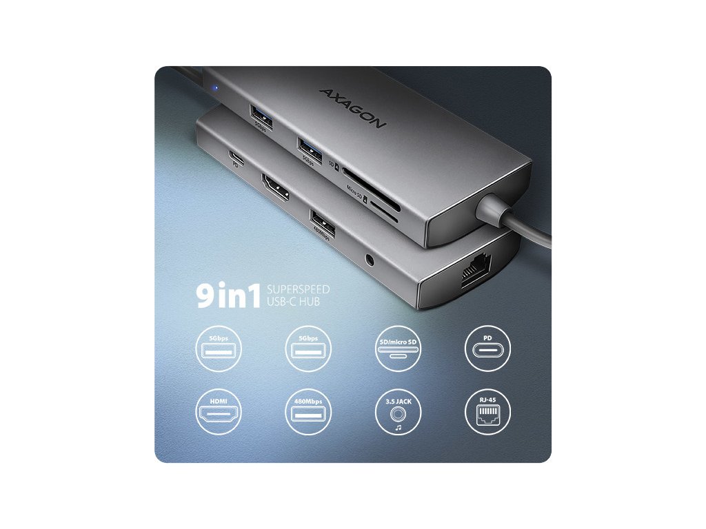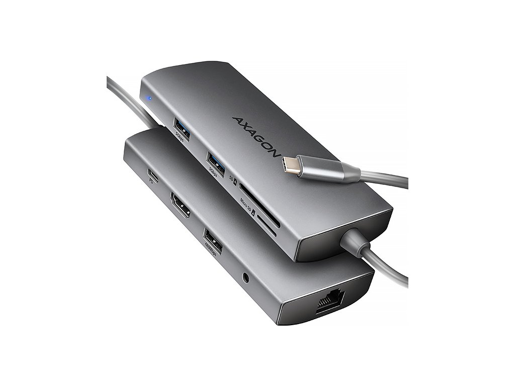 AXAGON HMC-8HLSA hub 9v1 USB-C 5Gbps multiport rozšíri váš notebook, počítač alebo telefón o deväť portov. Prostredníctvom obojstranného USB-C konektora ľahko a rýchlo pripojíte k počítaču súčasne monitor, tri USB zariadenia, sieť Gigabit Ethernet, slúchadlá s mikrofónom a čítačku SD kariet. Zároveň získate možnosť napájania notebooku pomocou technológie Power Delivery. Replikátor portov vám poskytne jednoduchú a kompaktnú dokovaciu stanicu 9 v 1 nielen pre notebooky so systémom Windows, ale aj pre notebooky Apple ako MacBook Air alebo MacBook Pro.