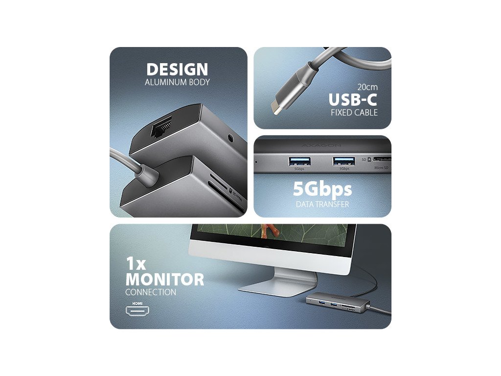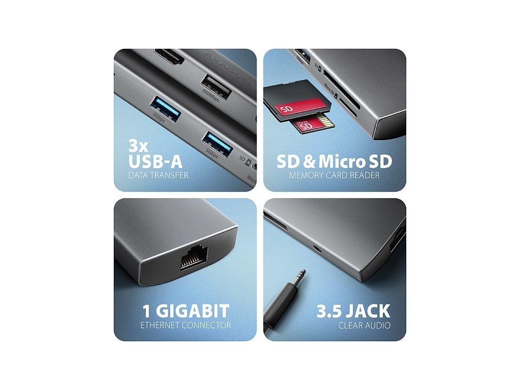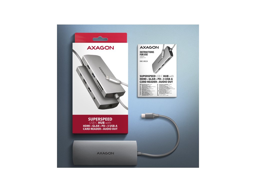 AXAGON HMC-8HLSA, USB 5Gbps hub, 3x USB-A, HDMI 4k/60Hz, RJ-45 GLAN, SD/microSD, audio, PD 100W, kábel USB-C 20cm
