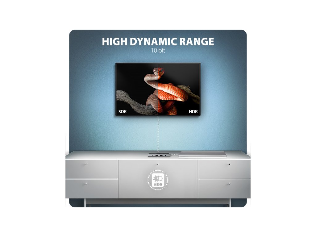 Vďaka podpore HDR (High Dynamic Range) si môžete vychutnať výrazne rozšírenú škálu farieb a kontrastov bez obmedzení. Aby video výstup fungoval správne, musí mať prenosný počítač port USB-C s podporou alternatívneho režimu DisplayPort (DP Alt Mode) alebo port Thunderbolt 3, 4 a vyšší.