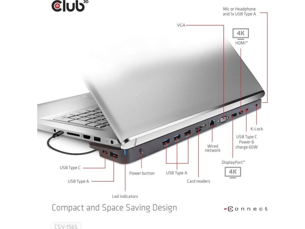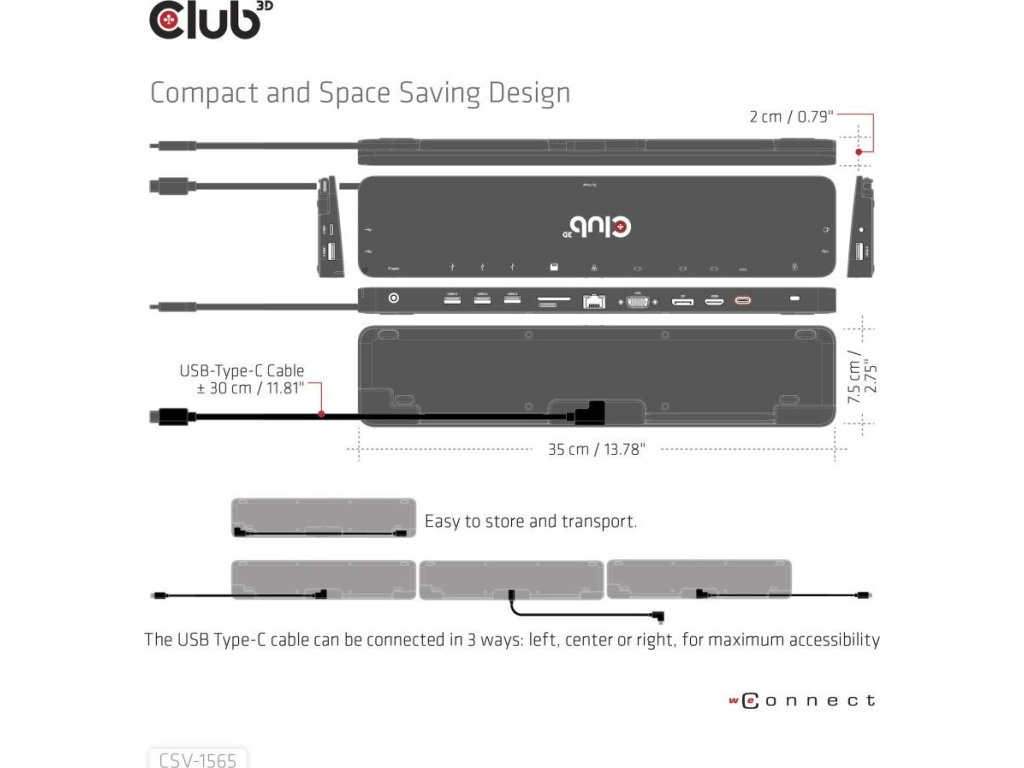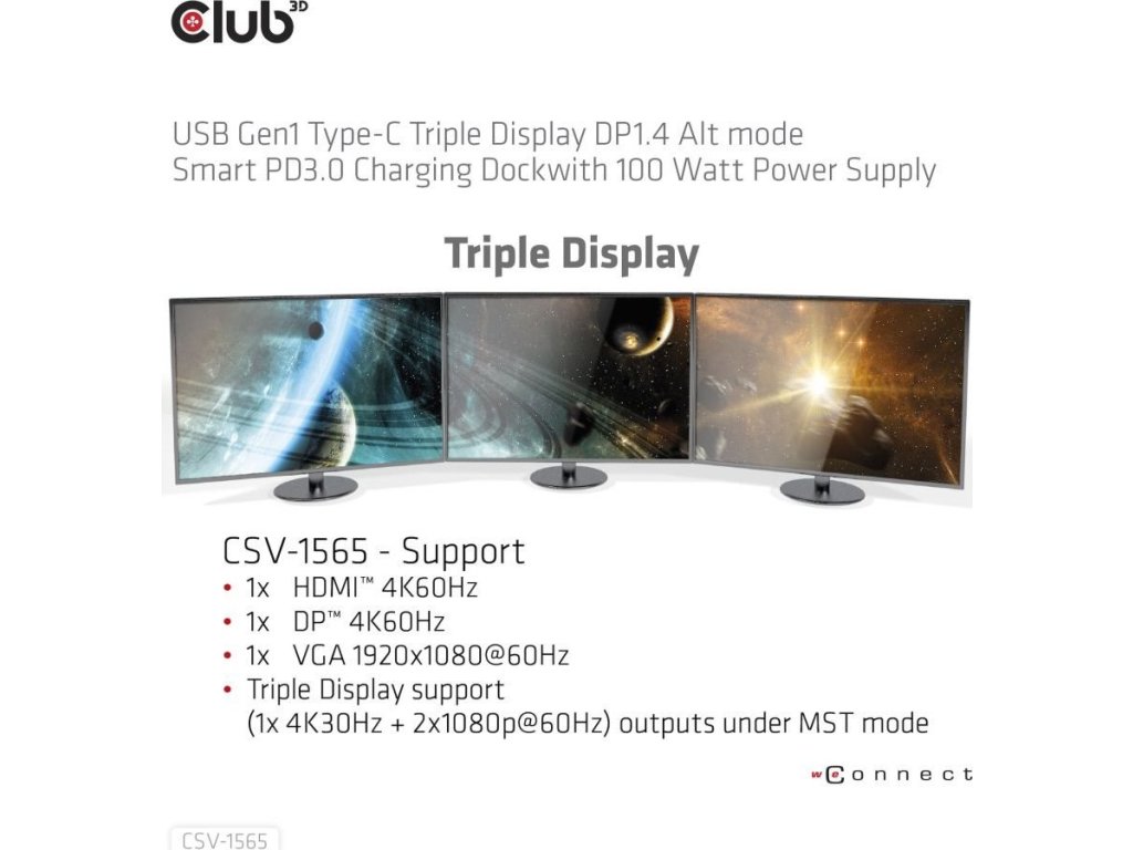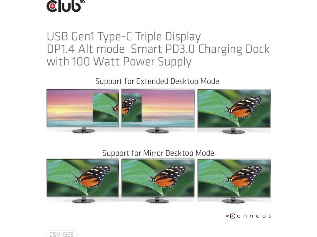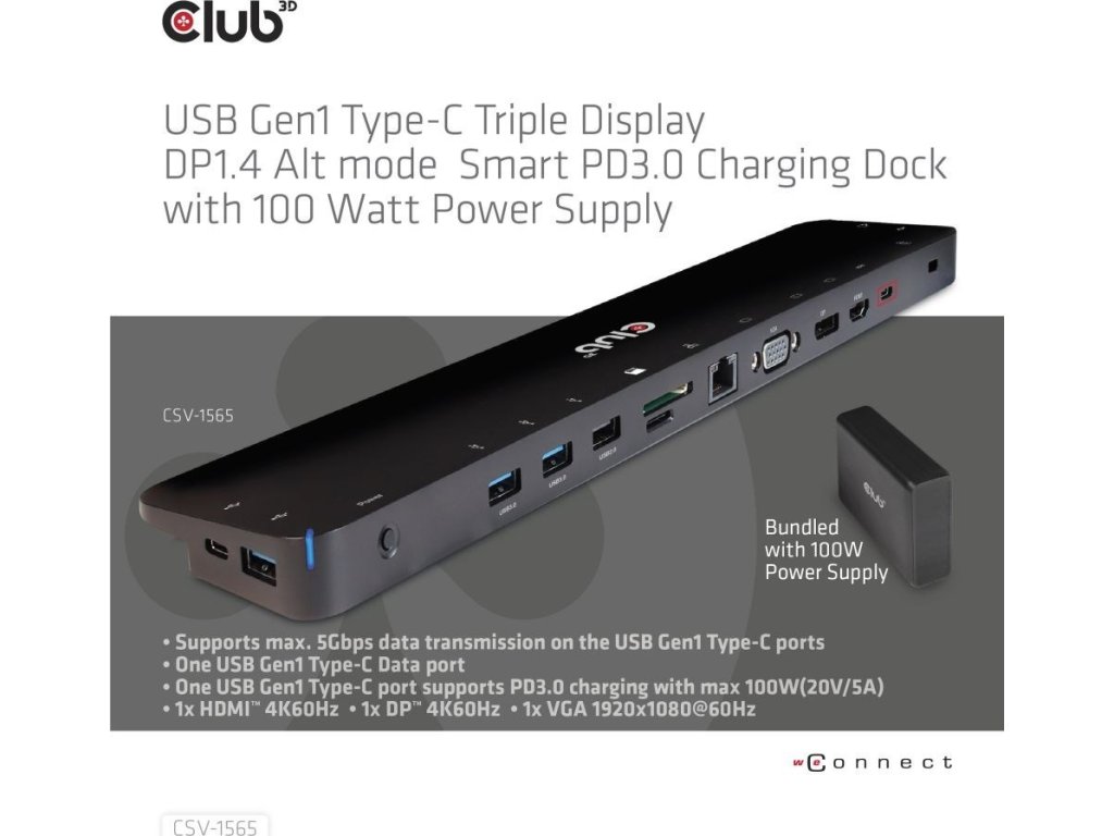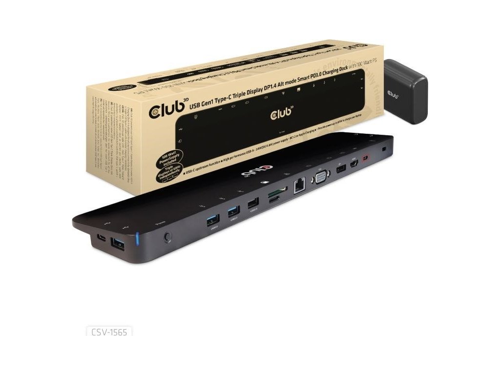 Club 3D CSV-1568 USB Gen2 Type-C Triple Display DP™ Alt mode + Smart PD Charging Dock so 120 W PSU je integrované riešenie, ktoré kombinuje video, dáta, napájanie, ethernet a zvuk. Má 4 videá (výstup 3 videí súčasne v režime MST) na prenos videa, 4 dátové porty USB (2 USB-A 10G, 1 Type-C 10G, 1 USB-A 5G) na prenos dát, 1 inteligentný nabíjací port USB-A na rýchle nabíjanie, 1 gigabitový ethernetový port na superrýchly ethernet, 2 audio porty (3.5 mm audio, Toslink) na počúvanie hudby. Okrem toho je táto dokovacia stanica vybavená dvojitým napájacím konektorom (nabíjanie PD typu C alebo 120W jednosmerný zdroj).