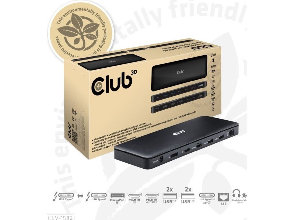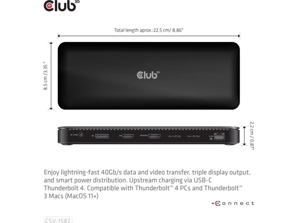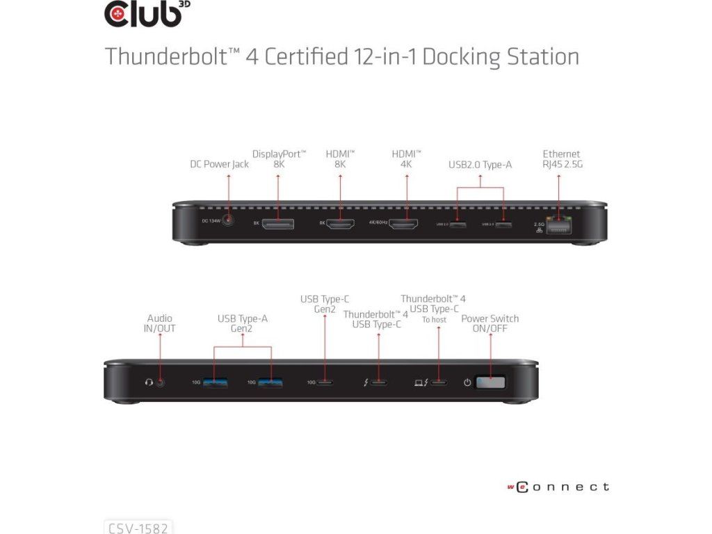 Club 3D CSV-1582 je certifikovaná docking station Thunderbolt™ 4 12 v 1, ktorá poskytuje najmodernejšie, najefektívnejšie a najuniverzálnejšie dostupné I/O riešenie s rýchlosťou až 40 Gb/s pre dáta a video. Kombinácia funkcií TB4 so jednoduchosťou integrovaného docking station, ktorá vám umožní vysielať 3 streamy na 3 displeje súčasne s rozšírenými stolnými displejmi na TB4/USB4 Windows PC. Ethernet RJ45 podporuje maximálnu šírku pásma 2,5G. Porty USB podporujú prenos dát rýchlosťou až 10G. Docking station podporuje funkciu smart power, ktorá umožňuje rozdeľovať energiu podľa spotreby energie pripojeného zariadenia s úplným využitím externého napájania. Je navrhnutá pre počítače so systémom Thunderbolt™ 4 a Mac-y založené na Thunderbolt™ 3 využívajúce MacOS 11 a novšie verzie.