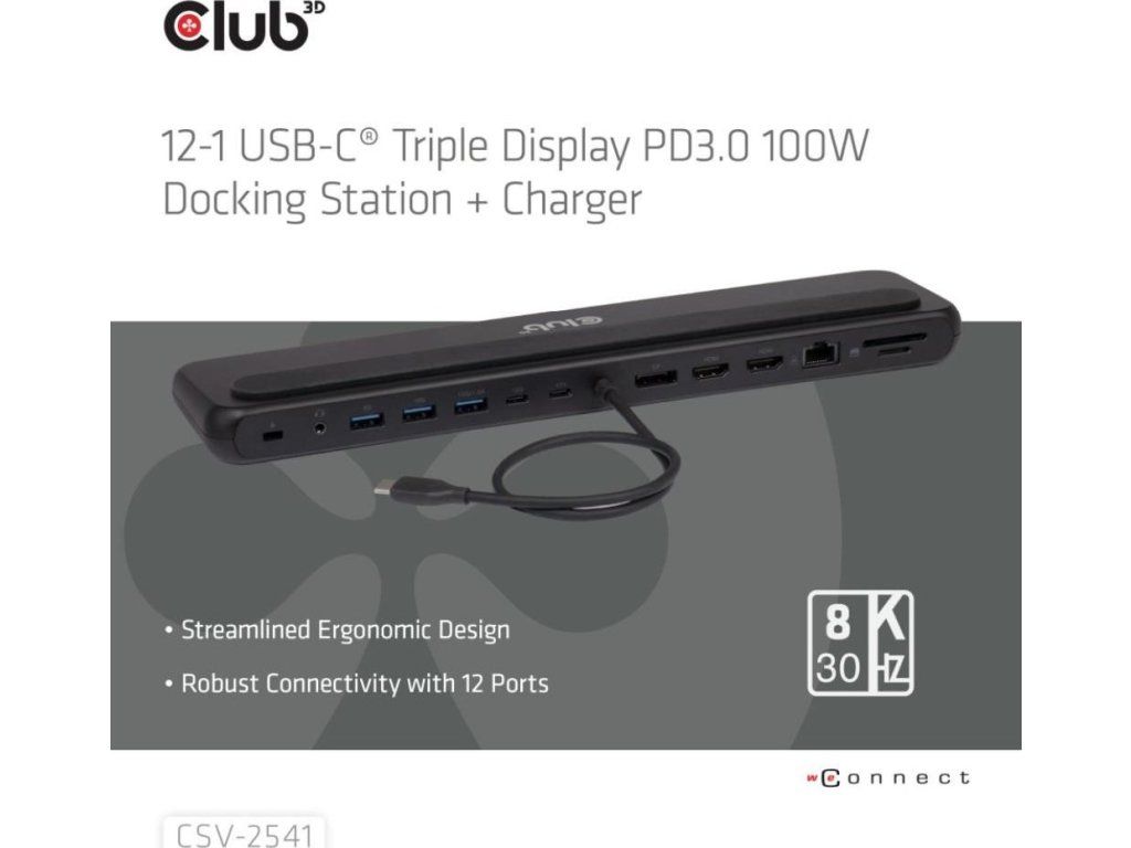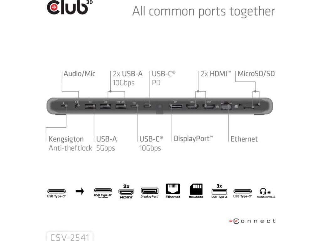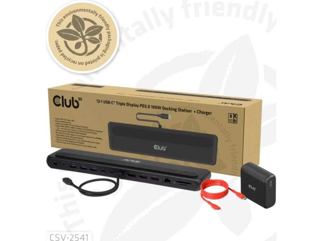 CSV-2541 je dokovacia stanica USB Type-C 10Gb/s 12 v 1 s trojitým displejom, 2x HDMI, 1x DisplayPort, 1x dátový port USB Type-C, 3x USB Type-A, RJ45, čítačka kariet, 3,5mm audio port a nabíjací port USB Type-C, ktorá predstavuje ideálne riešenie pre rozšírenie hostiteľského počítača USB Type-C alebo Thunderbolt, najmä pre hostiteľov s jediným portom USB Type-C. Vďaka konštrukcii s dolným držiakom môže byť stabilným stojanom pre vaše notebooky. Dodáva sa so 100W nabíjačkou a kábla, ktorý je súčasťou balenia.