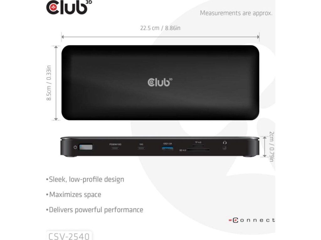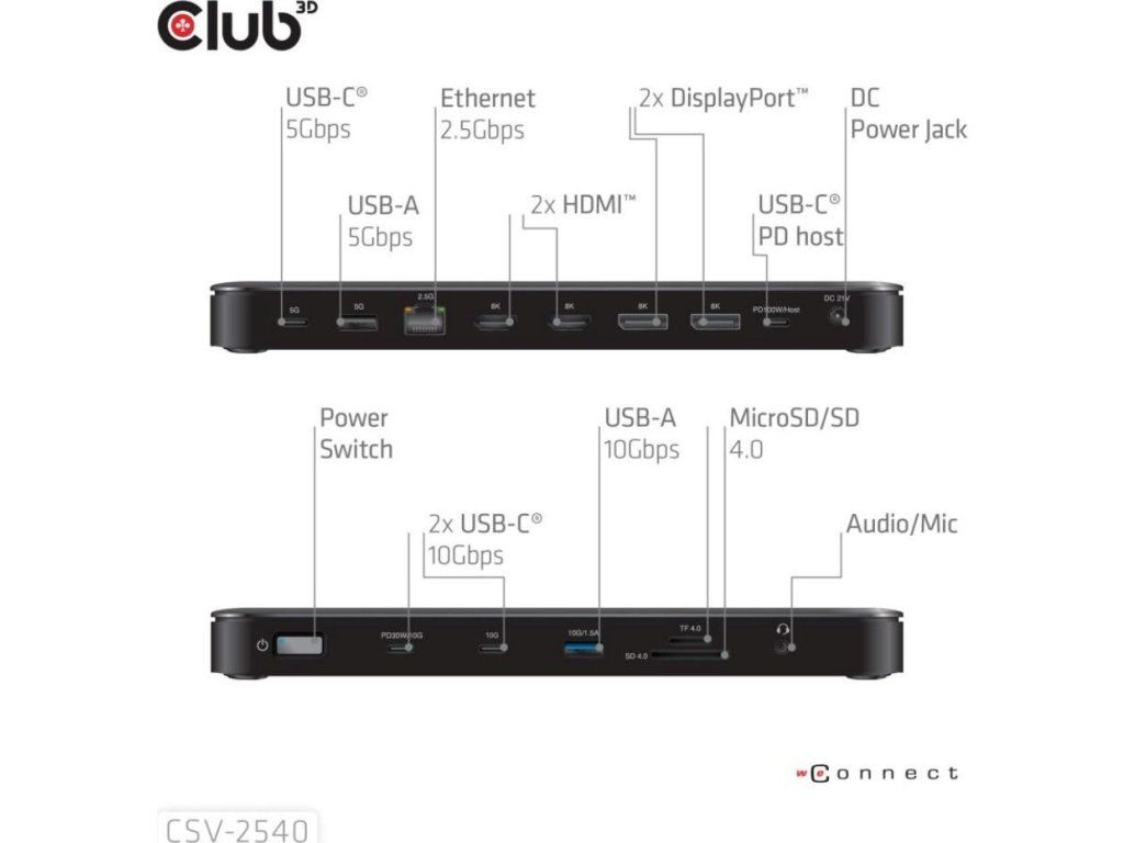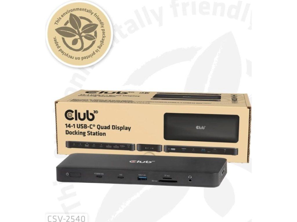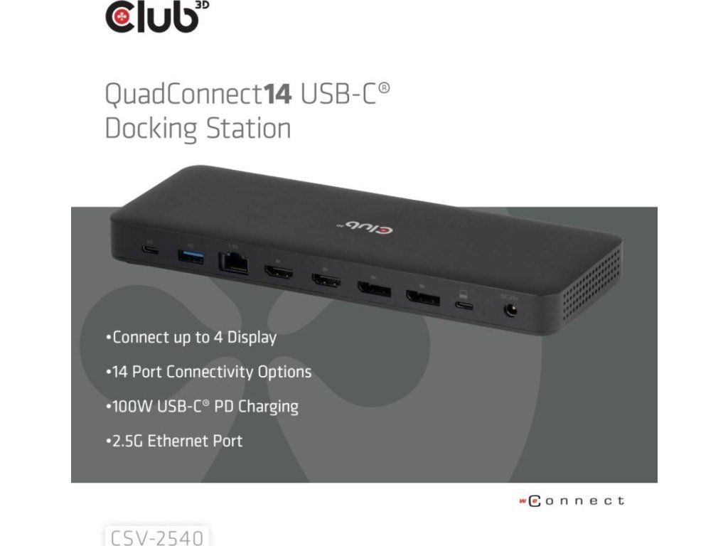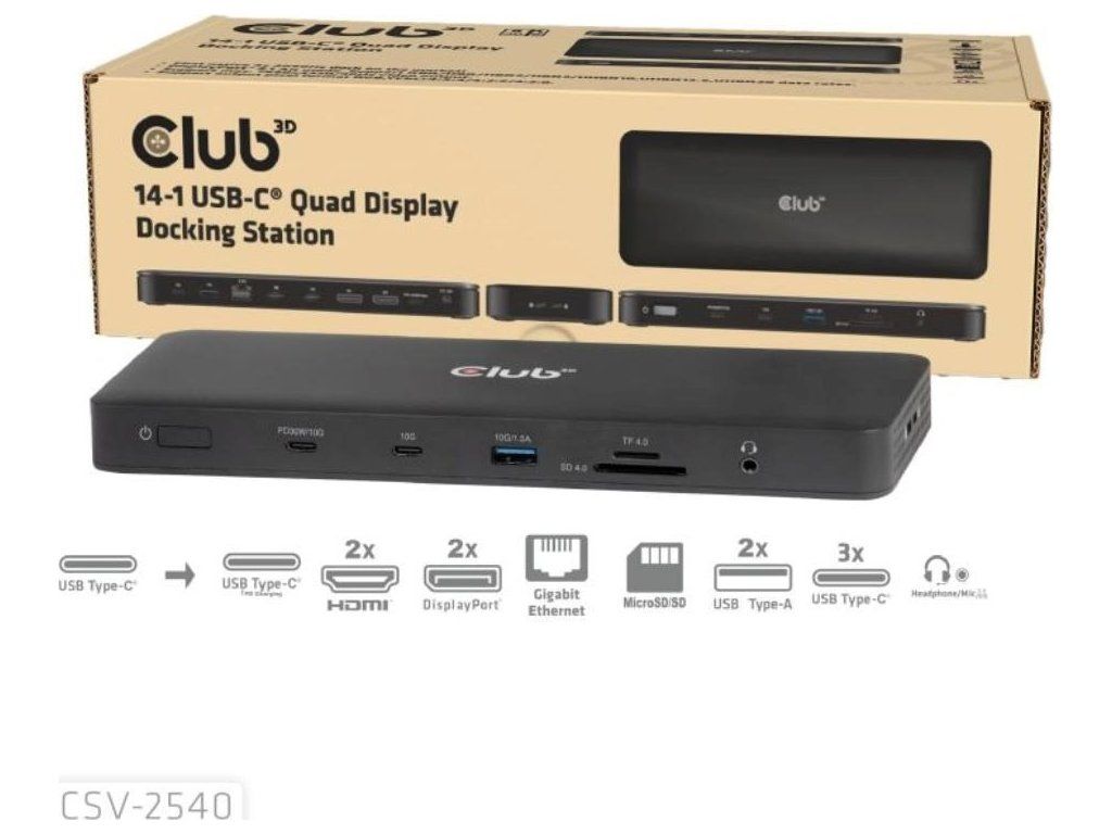 Club3D Dokovací stanice USB-C 14v1, 2xHDMI, 2xDP, 3xUSB-C, 1xUSB-C PD, 2xUSB, 1xRJ45, 1x3.5mm, microSD/SD, černá