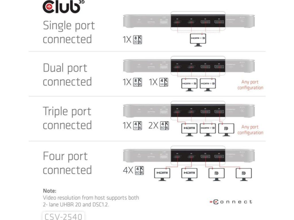 CSV-2540 je prenosná dockovacia stanica 14 v 1 USB Type-C 10Gb/s na štyri displeje s režimom 2 pruhov DisplayPort™ 2.1 Alt , ktorá slúži na rozšírenie portu Type-C o viac portov pre video, dáta, zvuk, Ethernet a napájanie a predstavuje ideálne riešenie na splnenie požiadaviek používateľov na rozšírenie. Má 4 videá (výstup štyroch 4K/60Hz videí súčasne, ak hostiteľ podporuje oba UHBR10&DSC) pre prenos videa, 5 portov USB pre prenos dát. 2,5 Gigabit Ethernet pre ultrarýchly Ethernet, microSD/SD kartu čítačku, 3,5mm kombinovaný audio konektor. Okrem toho je táto dockovacia stanica vybavená 150W jednosmerného napájania, ktoré ponúka max. 100 W pre pripojený počítač a tiež max. 30W nabíjania pre mobilné zariadenia USB-C.