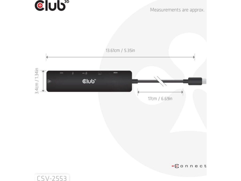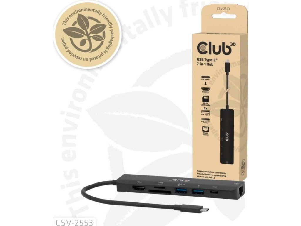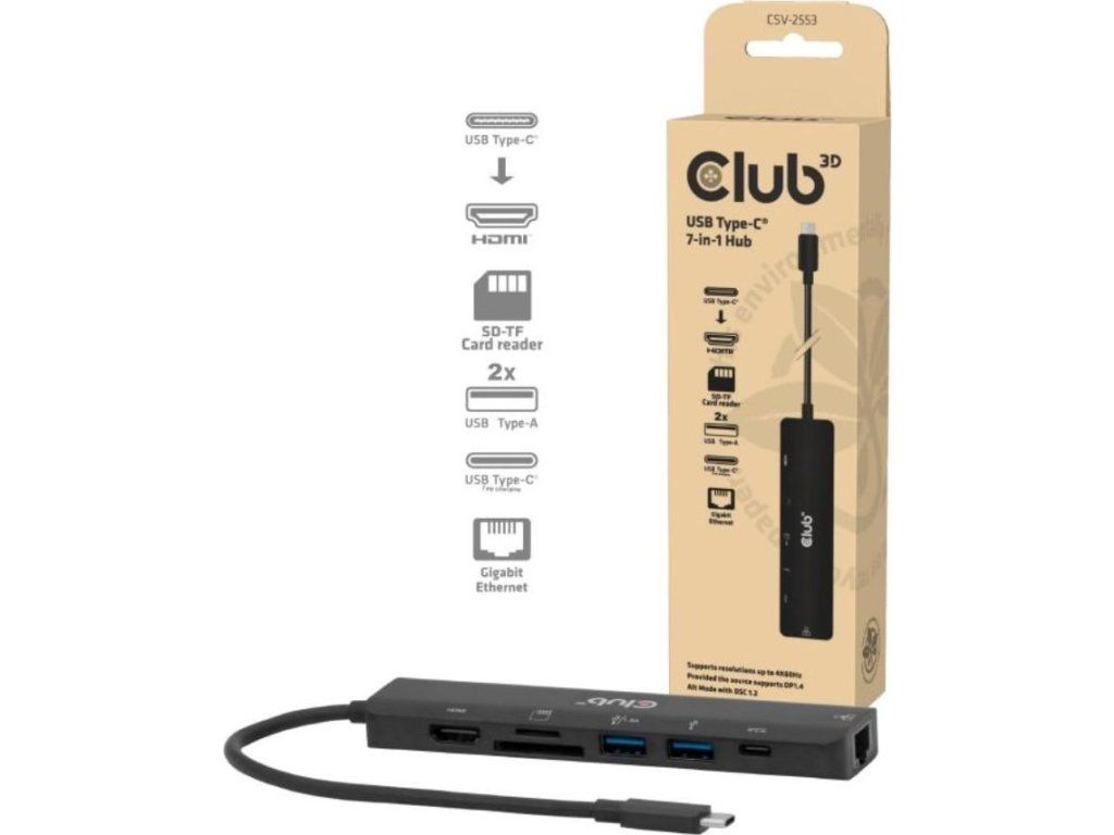 Club 3D CSV-2553 je USB-C, rozbočovač 7 v 1 s HDMI, 2x USB, RJ45, slotmi pre karty microSD/SD a portom USB-C samice, ktorý predstavuje ideálne riešenie na rozšírenie USB-C alebo Thunderbolt 3 (PC/laptop/tablet/mobilný telefón atď.) špeciálne pre hostiteľov s jediným portom USB-C.