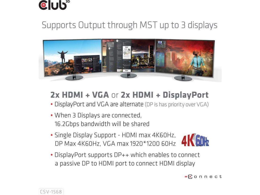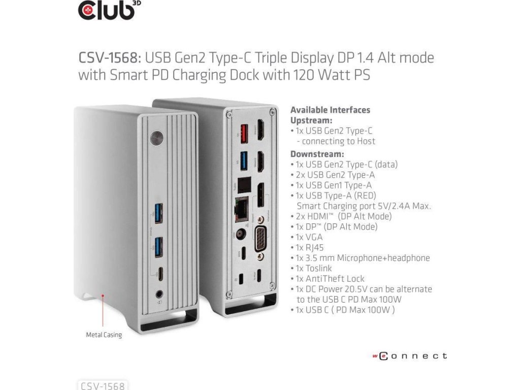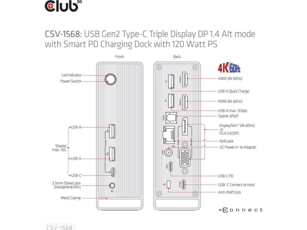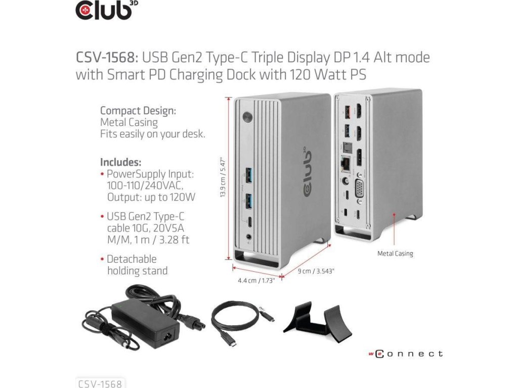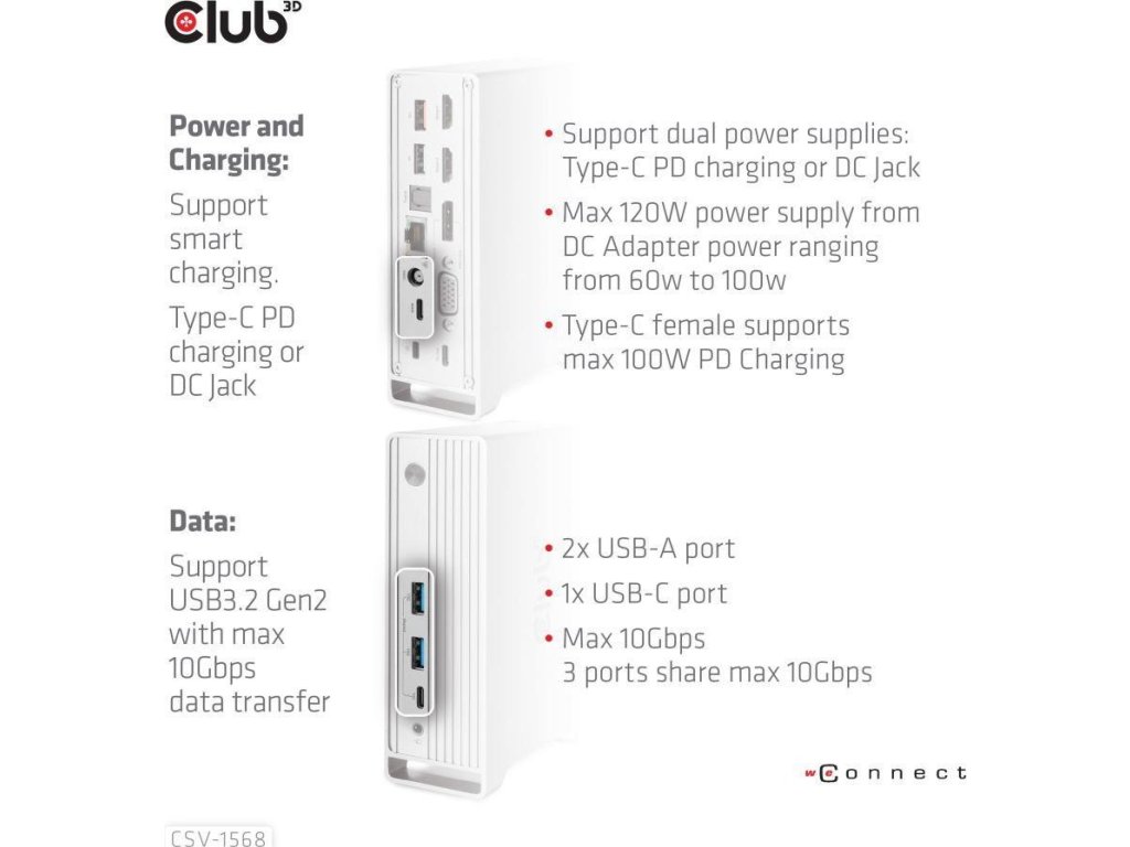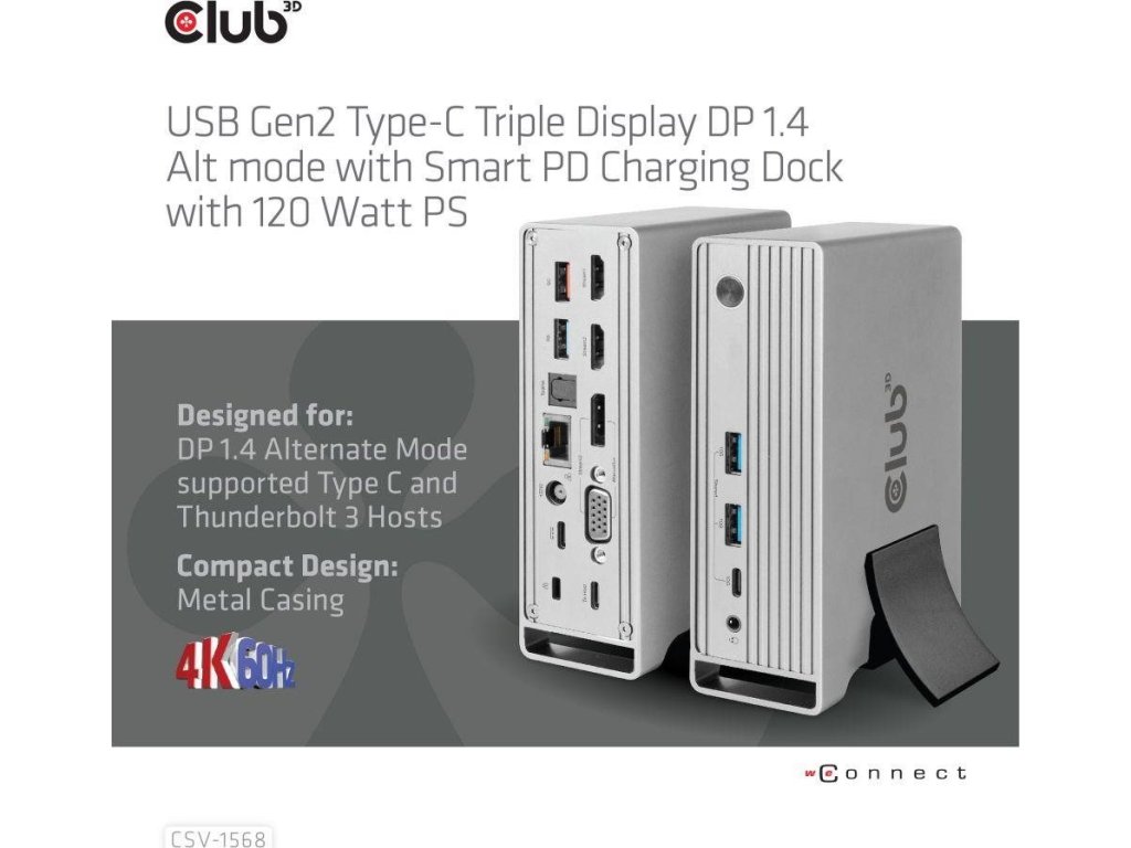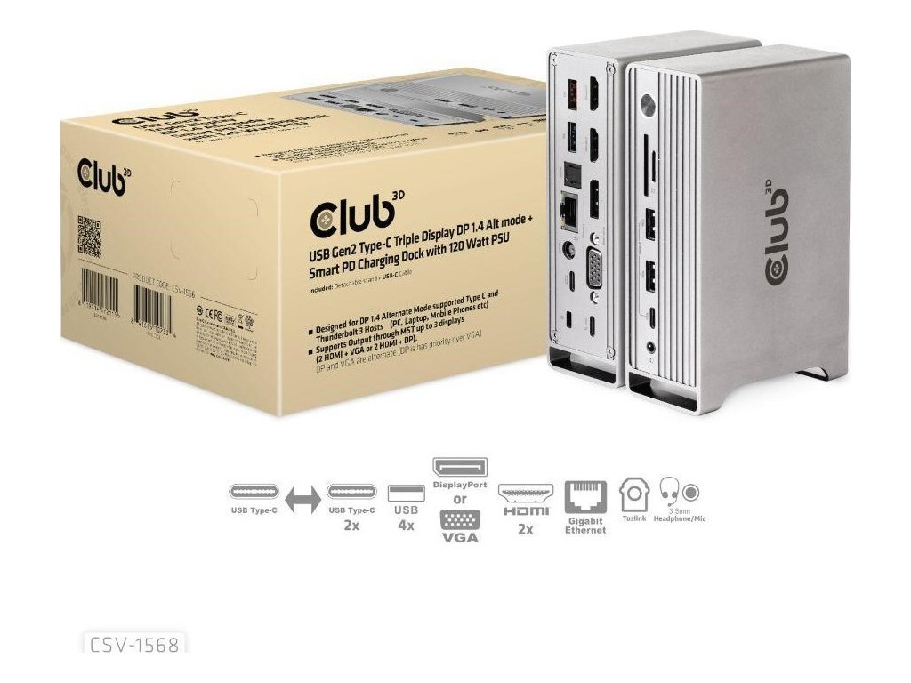 Club 3D CSV-1568 USB Gen2 Type-C Triple Display DP™ Alt mode + Smart PD Charging Dock so 120 W PSU je integrované riešenie, ktoré kombinuje video, dáta, napájanie, ethernet a zvuk. Má 4 videá (výstup 3 videí súčasne v režime MST) na prenos videa, 4 dátové porty USB (2 USB-A 10G, 1 Type-C 10G, 1 USB-A 5G) na prenos dát, 1 inteligentný nabíjací port USB-A na rýchle nabíjanie, 1 gigabitový ethernetový port na superrýchly ethernet, 2 audio porty (3.5 mm audio, Toslink) na počúvanie hudby. Okrem toho je táto dokovacia stanica vybavená dvojitým napájacím konektorom (nabíjanie PD typu C alebo 120W jednosmerný zdroj).