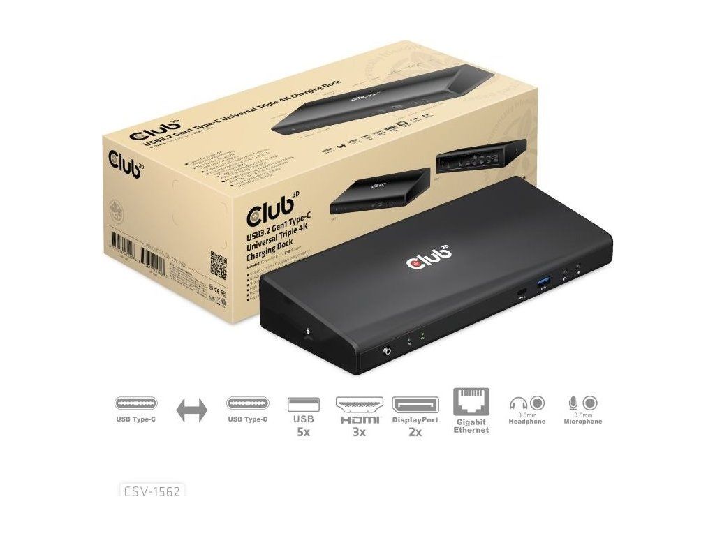 Dokovacia stanica USB Club3D 3.2 typy C (5xUSB/USB-C/3xHDMI/2xDP/Ethernet/Audio) s univerzálnym trojitým napájacím adaptérom 4K
