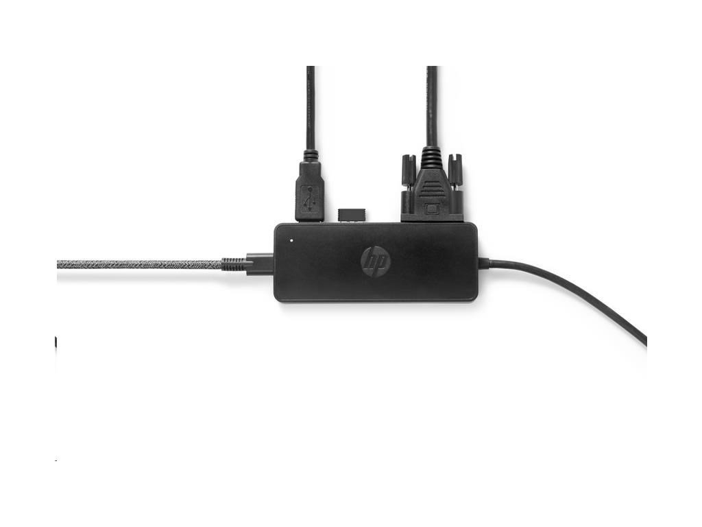 Cestovný rozbočovač HP USB-C G2 rozširuje port USB-C notebooku o dva porty USB na pripojenie príslušenstva a výstup HDMI alebo VGA pre externý displej.