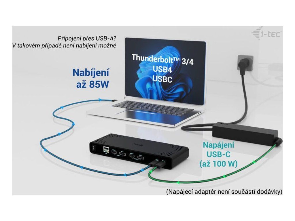 Poznámka: USB-C nabíjačka nie je súčasťou balenia. Dokovaciu stanicu je možné používať bez nabíjačky alebo s nabíjačkou dodanou napr. s vaším notebookom, prípadne je možné zakúpiť nabíjačku samostatne, napríklad i-tec CHARGER-C100W. Alternatívne je možné zakúpiť produktovú sadu CADUA4KDOCKPDB100, ktorá už obsahuje napájací zdroj.