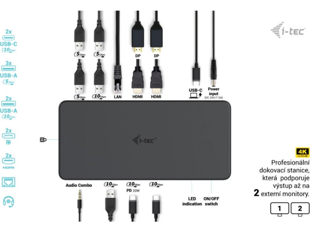 Výkonná kancelárska dokovacia stanica podporujúca superrýchle porty USB Gen 2 s rýchlym nabíjaním. Dokovacia stanica podporuje výstup až na dva externé monitory vo vysokom rozlíšení až 4K. Stanicu je možné prakticky použiť so všetkými notebookmi, pretože podporuje pripojenie ku všetkým bežným portom: 3.0, USB-C a Thunderbolt“ 3/4 a zároveň podporuje všetky bežné súčasné operačné systémy.