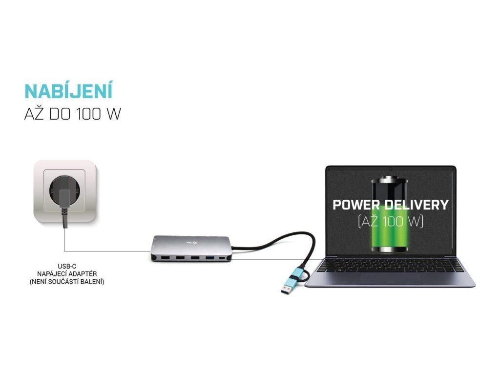 - Dokovacia stanica podporuje až 100W napájania pripojeného notebooku alebo tabletu