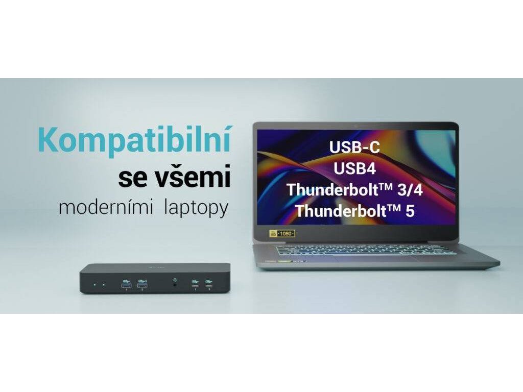 - Dokovacia stanica je kompatibilná so všetkými modernými notebookmi vybavenými portami USB-C, USB4 alebo Thunderbolt™ 3/4/5.
