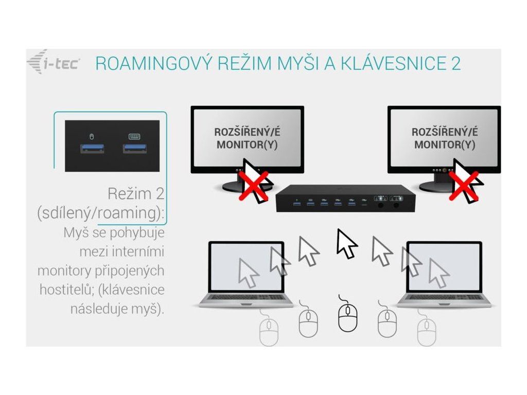 - Unikátna funkcia USB roaming umožňuje zdieľať dva vyhradené USB porty pre klávesnicu a myš medzi dvoma hostiteľmi súčasne, čo zabezpečuje maximálnu efektívnosť a pohodlie pri prepínaní medzi zariadeniami.