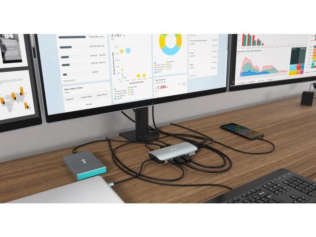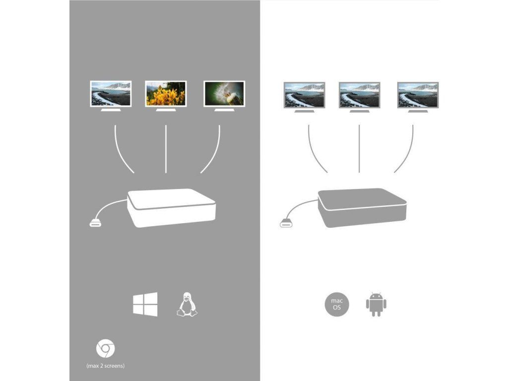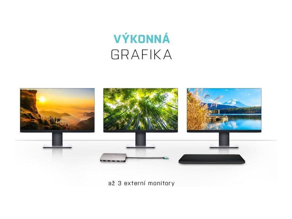 Malá kovová dokovacia stanica USB-C, ku ktorej možno pripojiť až tri externé monitory*. Stačí pripojiť notebook alebo tablet (bez potreby ovládačov) a využiť rýchle dátové pripojenie USB, pripojenie k internetu cez port LAN a možnosť pripojiť slúchadlá a mikrofón. Samozrejme, podporuje napájanie notebooku až do 100 W, čo znamená, že budete môcť nabíjať všetky notebooky a tablety, ktoré podporujú nabíjanie cez USB-C (USB-C Power Delivery).