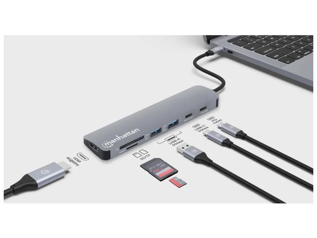 Rozšírte možnosti pripojenia svojho zariadenia pomocou multiportového adaptéra Manhattan 7 v 1. Táto všestranná dokovacia stanica vyplní medzery vo vašom notebooku, MacBooku, tablete alebo telefóne a ponúka základné pripojenia, ako je HDMI, PD, čítačka kariet a porty USB.