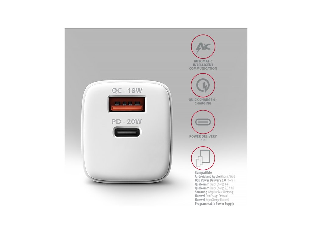 Nabíjačka je vybavená výstupmi Power Delivery 3.0 / Quick Charge 4+ USB typu C a Quick Charge 3.0 USB typu A, ktoré umožňujú rýchle nabíjanie smartfónov a tabletov s výkonom až 20W.
