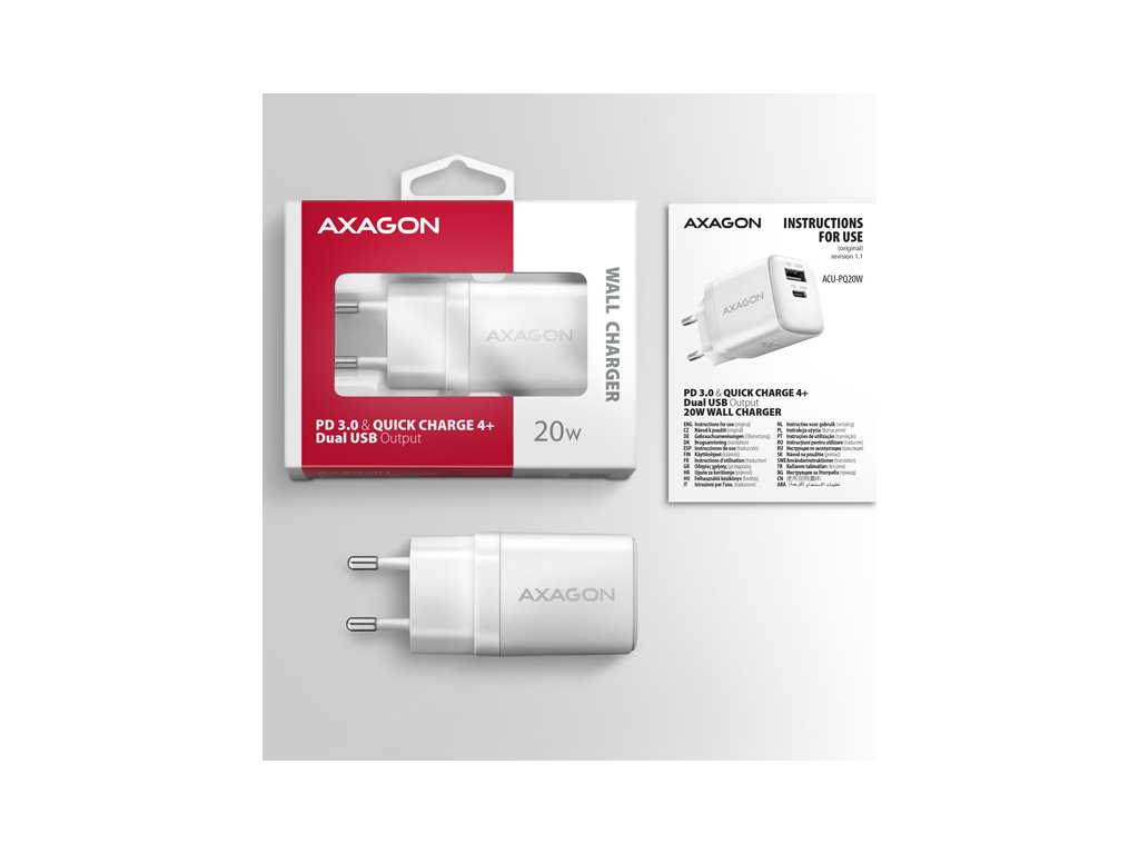 AXAGON ACU-PQ20W, nabíjačka do siete 20W, 2x port (USB-A + USB-C), PD3.0/PPS/QC4+/AFC/Apple, biela