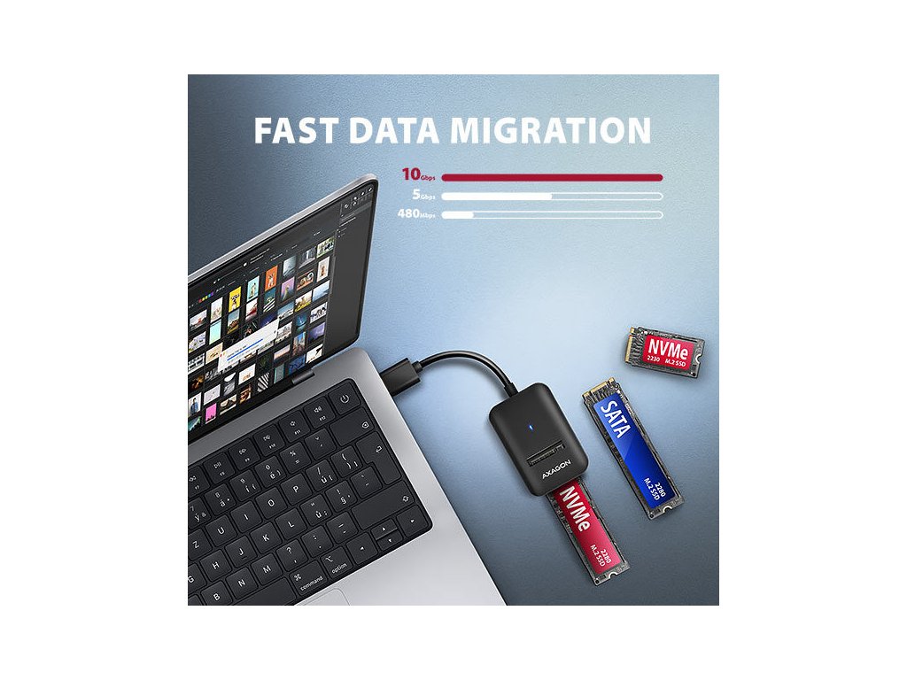 Díky USB 3.2 Gen 2 rozhraní je přenosová rychlost až 10 Gb/s. Druhá generace rychlého USB rozhraní dovolí užívat si rychlost moderních M.2 SSD disků. Univerzální M.2 adaptér podporuje i další moderní funkce např. UASP, TRIM a umožňuje čtení S.M.A.R.T. informací monitorujících stav disku. Podpora úsporného režimu při nečinnosti.