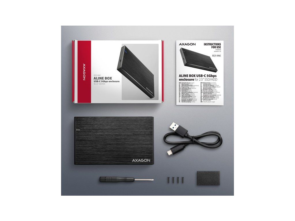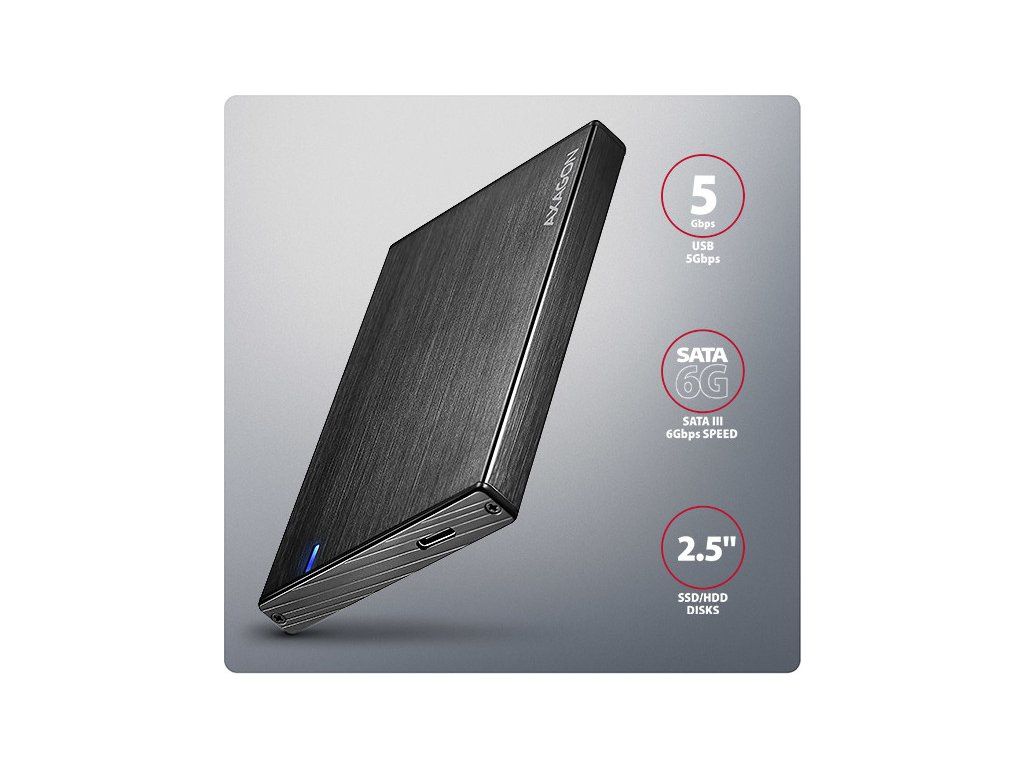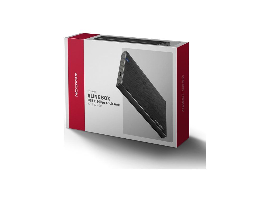 Kompaktný hliníkový externý AXAGON EE25-XA6C ALINE box s USB-C 5Gbps rozhraním určený pre 2.5" SATA pevné disky alebo SSD. Spoľahlivé pripojenie k počítaču umožňuje obojstranný USB-C konektor na boxe spolu s dodávaným káblom USB-C -> USB-A.
