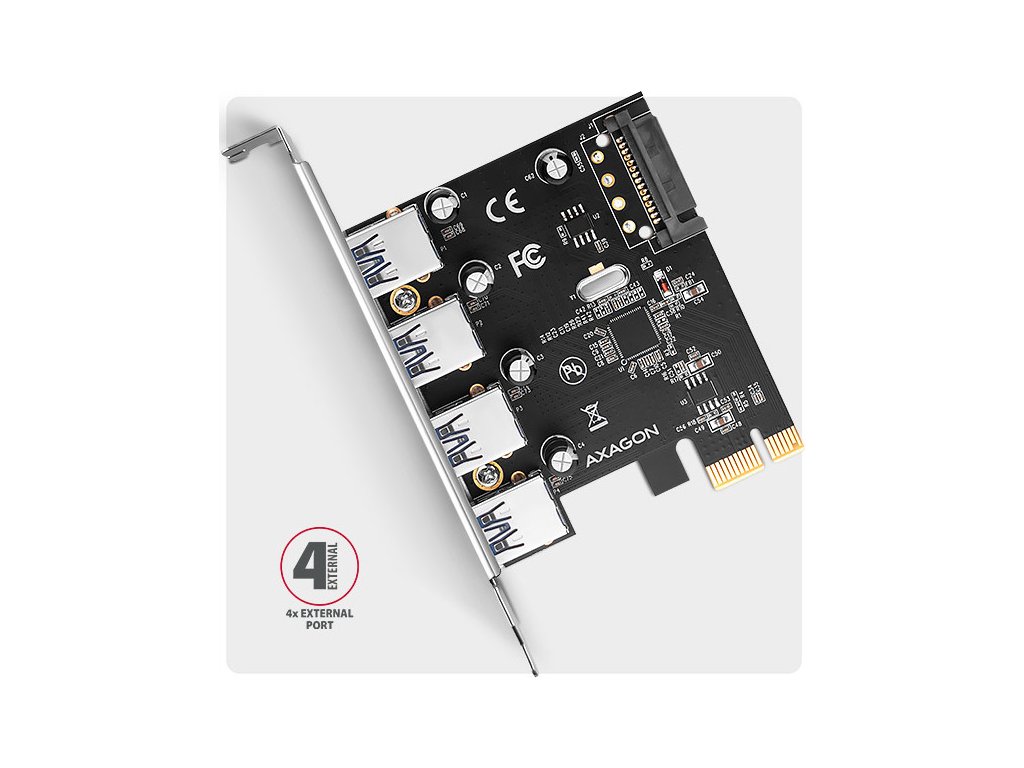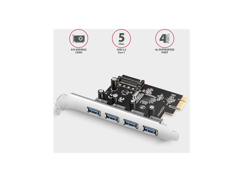 Karta AXAGON PCEU-430RS PCI-Express rozširuje stolný počítač o štyri externé USB-A 5Gbps porty. Karta je určená pre rýchle a stabilné prenosy dát rýchlosťou až 5 Gbps.