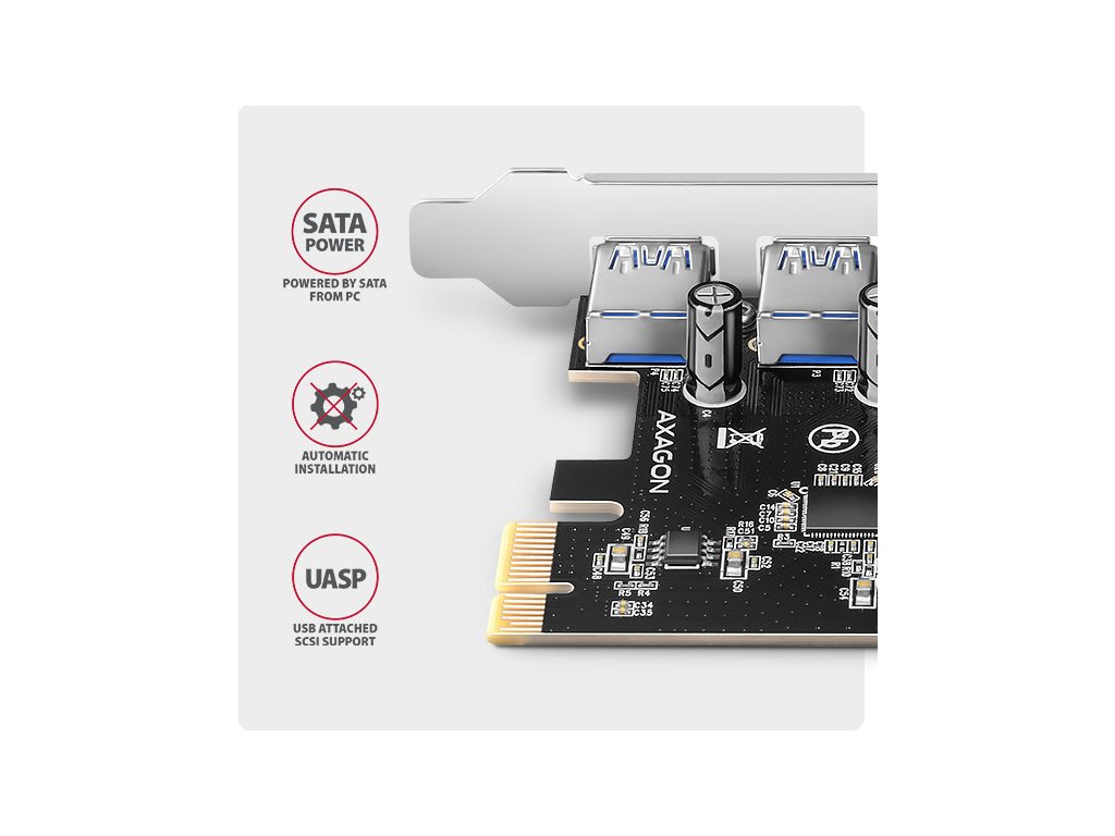 AXAGON PCEU-430RS, PCIe radič, 4x USB 5Gbps port, SATA napájanie, Renesas PD720201, SP