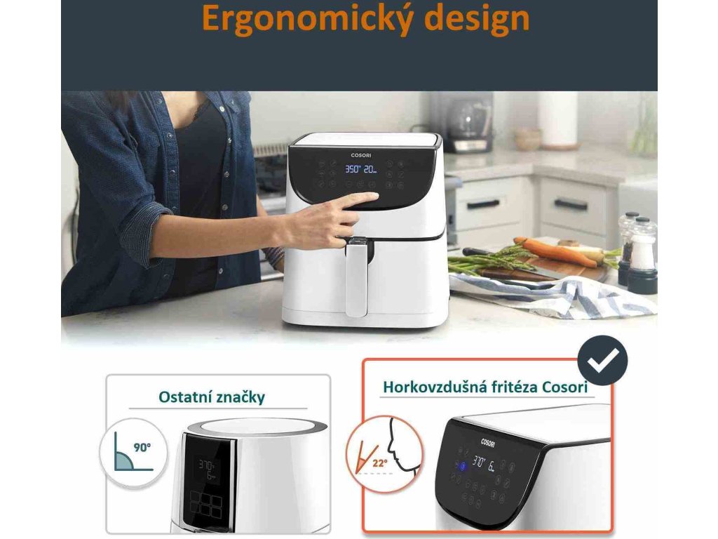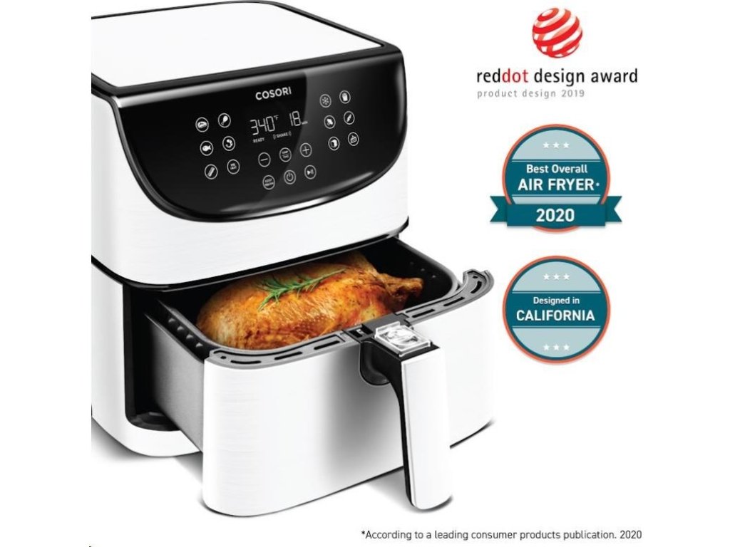 Dizajn teplovzdušnej fritézy COSORI CP158-AF bol navrhnutý v Kalifornii. Vďaka svojej praktickosti, funkciám, ovládaniu aj prehľadnému dotykovému naklonenému LED displeju sa ľahko prístupnými tlačidlami získal aj prestížne ocenenie Red Dot Award za najlepší dizajn.