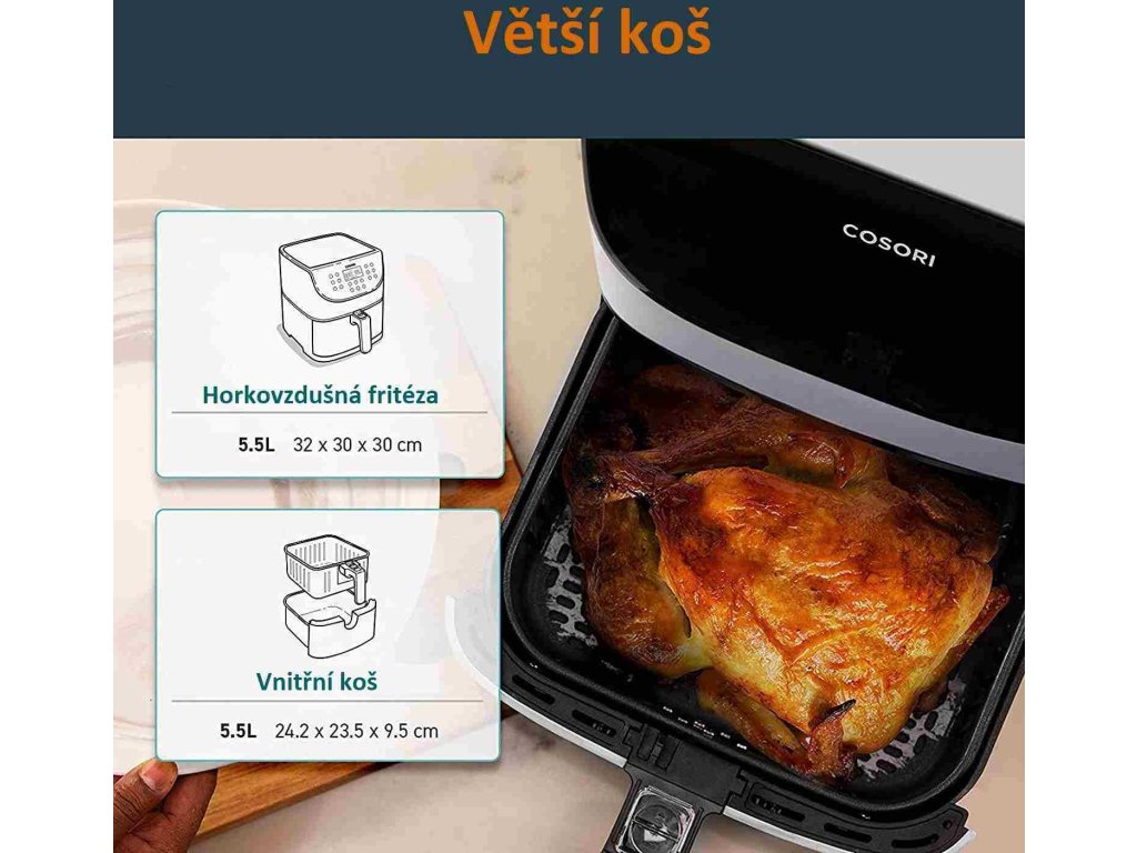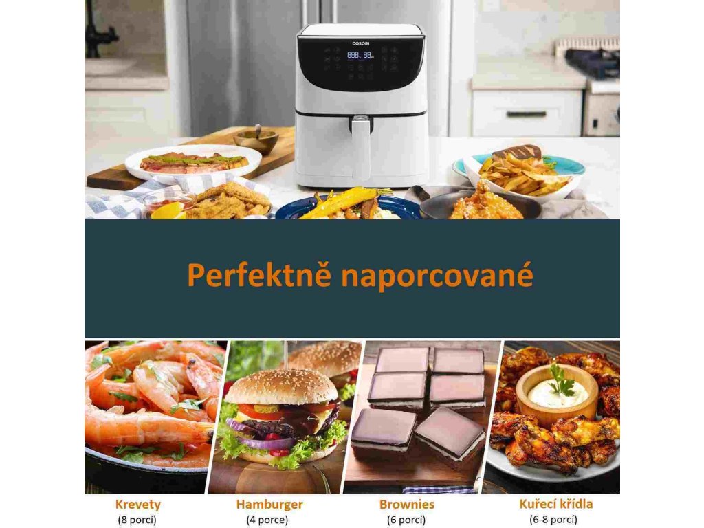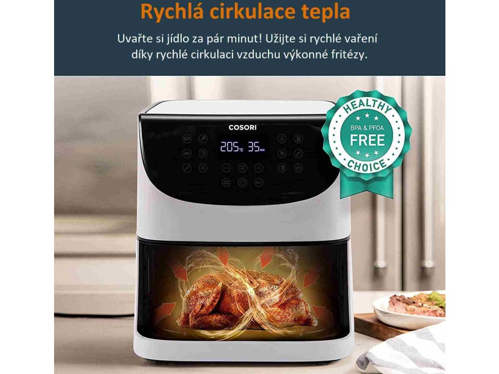 S teplovzdušnou fritézou COSORI CP158-AF PREMIUM si môžete užiť vaše obľúbené vyprážané jedlá bez výčitiek, pretože na rozdiel od bežného vyprážania alebo fritovania je možné v nej pripravovať jedlá za použitia veľmi malého množstva oleja alebo vôbec žiadneho. Kombinácia cirkulujúceho horúceho vzduchu, dokonalej teploty varenia a chytrých programov zaistí, že hranolky budú vždy krásne chrumkavé a kuracie stehná šťavnaté. Či už je vaše jedlo čerstvé alebo mrazené, stlačením tlačidla môžete horúcim vzduchom smažiť kuracie krídla, kuracie prsia, sladké zemiaky, steaky, čerstvé hranolky a mnoho ďalšieho. Až budete mať hotovo, čistenie bude rovnako jednoduché vďaka nepriľnavému košu, ktorý je možné umývať v umývačke. Vďaka veľkej nádobe s objemom 5,5 l navyše dokážete rýchlo navariť aj pre väčšiu rodinu alebo skupinu hostí.