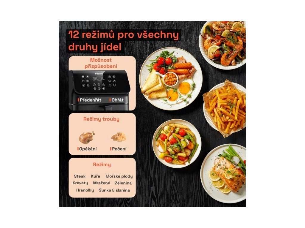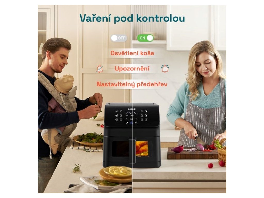 Predstavujeme teplovzdušnú fritézu Cosori Premium II vo verzii Plus. Inovatívne riešenie, ktoré šetrí nielen čas, ale aj energiu a ponúka spôsob varenia, ktorý je šetrný k zdraviu. S teplovzdušnou fritézou si môžete vychutnať svoje obľúbené jedlá pripravené s minimom oleja, vyhnete sa zápachu z vyprážania a čistenie je vďaka košu, ktorý možno umývať v umývačke riadu, hračkou. Fritéza ponúka kôš s veľkorysým objemom 6,2 litra, takže v nej pohodlne pripravíte jedlo pre 3 až 5 osôb, napríklad celé kurča s hmotnosťou 2,3 kg. Verzie Plus je vybavená okienkom a svetlom, takže vidíte, v akej fáze prípravy sa práve nachádzate, bez toho aby ste museli vysúvať kôš a prerušovať prípravu. Pri veľkom objeme si fritéza zachováva malé vonkajšie rozmery, takže je vhodná aj do malých kuchýň. Vďaka technológii 360° cirkulácie vzduchu sa fritéza zohreje na prevádzkovú teplotu za menej ako 5 minút, čo ďalej výrazne skracuje čas prípravy. Malý objem znamená aj nízku spotrebu energie v porovnaní s bežnou rúrou. Fritéza ponúka 12 programov na prípravu pokrmov, ktoré možno nastaviť podľa individuálnych chutí. Displej fritézy je prehľadný a pohodlne naklonený pre dokonalú čitateľnosť. V dnešnej digitálnej dobe je atraktívna aj funkcia stlmenia tlačidiel. Ako bonus k dodávanej viacjazyčnej kuchárskej knihe si môžete stiahnuť elektronickú kuchársku knihu s 80 receptami v českom aj slovenskom jazyku. V balení nájdete aj 5 ihiel na špíz a mriežku na špíz.