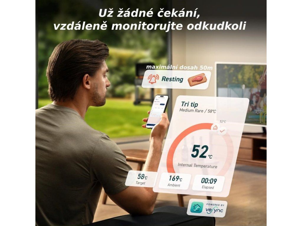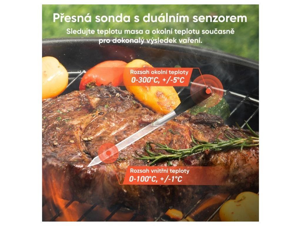 Úplná kontrola nad prípravou mäsa. Vďaka duálnemu senzoru neustále monitoruje vnútornú teplotu mäsa aj teplotu okolia. To zaručuje presné výsledky a eliminuje akékoľvek dohady o správnom stupni prepečenia. Aplikácia vás upozorní, keď je čas otočiť mäso, a dokonca aj keď je ideálny čas nechať ho odpočívať, aby bolo dokonale šťavnaté. Žiadne dohady, len perfektné výsledky pri každom varení.