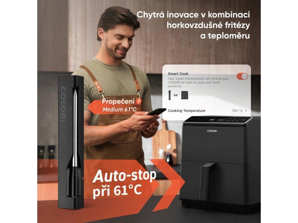 Teplomer Cosori nie je len samostatným nástrojom, ale je plne kompatibilný s inteligentnými fritézami Cosori, ako sú Dual Blaze, TwinFry, Turbo Tower Pro a Premium Smart. Vďaka tejto konektivite môžete cez aplikáciu nastaviť požadovanú úroveň varenia a teplomer automaticky synchronizuje čas a teplotu s vašou fritézou. Fritéza sa navyše sama vypne, keď je mäso dokonale uvarené, čím vám ušetrí čas a zaručí vždy perfektné výsledky.