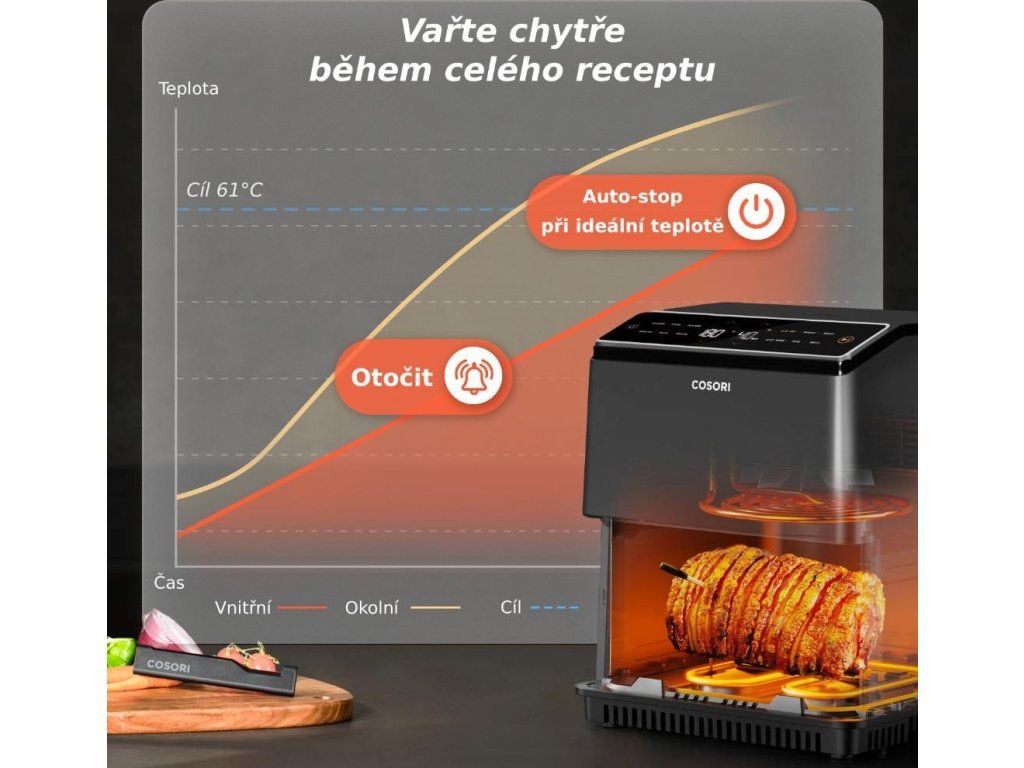 Aplikácia COSORI funguje ako váš osobný sprievodca varením. Nielenže vás prevedie celým receptom, ale tiež vám v reálnom čase zasiela upozornenia, keď je ideálny čas otočiť mäso alebo ho nechať odpočívať. Teplomer sleduje priebeh prípravy za vás, takže sa môžete sústrediť na iné veci bez obáv, že mäso prepečiete.