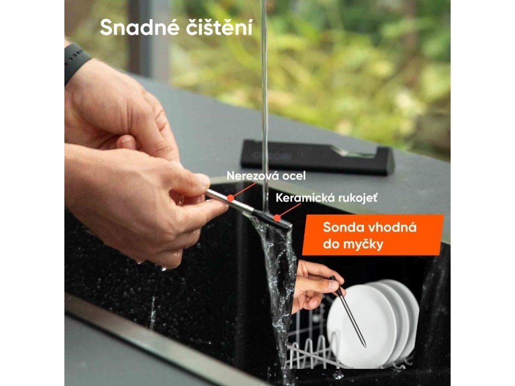 Vďaka svojmu dizajnu a použitým materiálom je inteligentný teplomer COSORI veľmi ľahko udržiavateľný. Sonda je vyrobená z nehrdzavejúcej ocele a keramiky, čo nielen zaručuje odolnosť, ale spĺňa aj prísne požiadavky na materiály určené na kontakt s potravinami. S certifikáciou IP67 je sonda vodotesná, takže ju môžete bez obáv umývať ručne alebo umiestniť do umývačky riadu.