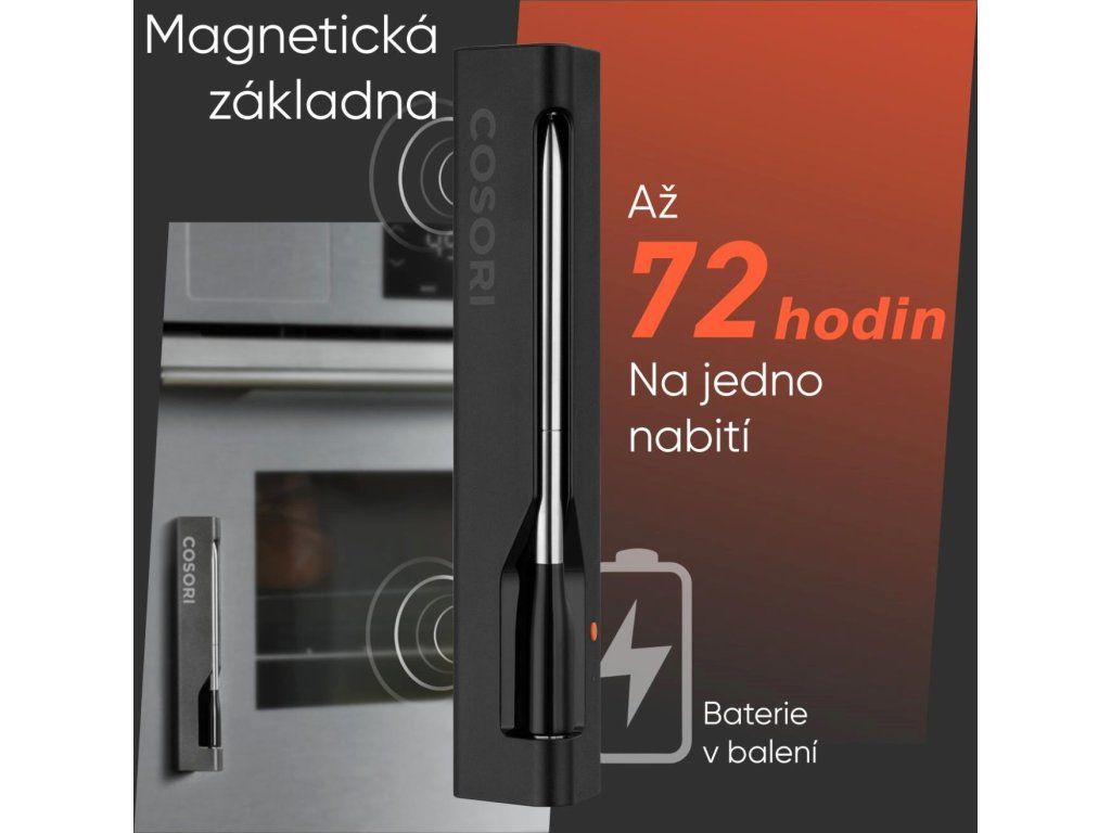 Teplomer COSORI získal prestížnu cenu iF Design Award 2023, ktorá vyzdvihuje jeho dokonalý vzhľad a robustnú konštrukciu. Sonda je vyrobená z nehrdzavejúcej ocele a keramiky, čo zaručuje bezpečné a zdravé používanie. Batéria sondy vydrží na jedno nabitie až 72 hodín, čo zaručuje nepretržité monitorovanie aj počas najdlhších príprav. Nabíjacie puzdro má tiež integrovaný magnet, takže ho môžete ľahko pripevniť na chladničku alebo iný kovový povrch pre pohodlné skladovanie. Sonda je vodotesná s certifikáciou IP67, takže ju môžete ľahko umývať ručne alebo v umývačke riadu. Vnútorný teplotný senzor meria mäso v rozmedzí od 0 °C do 100 °C s presnosťou ±1 °C, zatiaľ čo senzor okolitej teploty zvládne rozsah až do 300 °C.