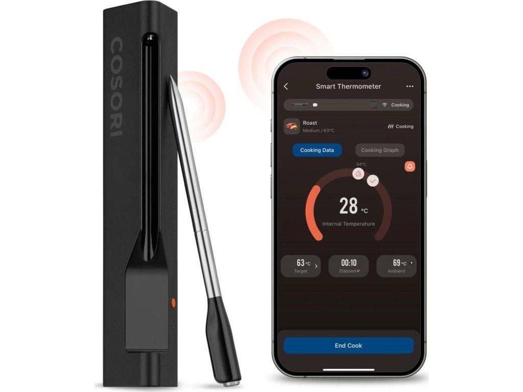 Inteligentný teplomer COSORI je navrhnutý tak, aby bol univerzálnym pomocníkom v každej kuchyni. Môžete ho používať s rôznymi kuchynskými spotrebičmi, ako sú domáce rúry, grily, udírne alebo pri varení na klasickom sporáku. Teplomer je ideálny pre každého, kto chce dosiahnuť perfektné výsledky bez ohľadu na zvolenú metódu varenia.