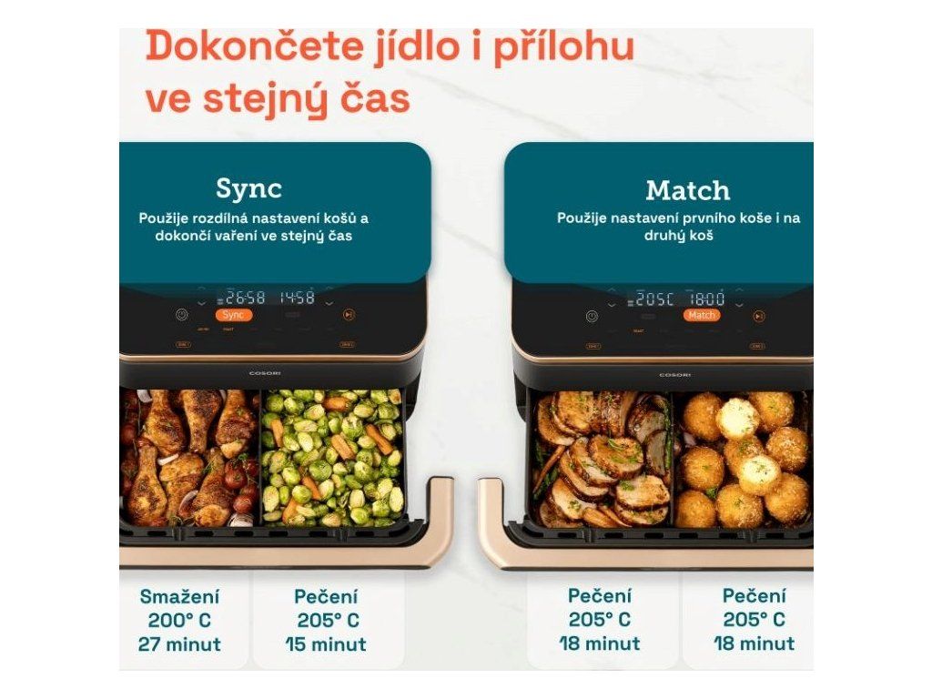 Fritéza má dômyselnú funkciu Sync. Ak rozdelíte kôš na dve časti a chcete pripraviť dve rôzne jedlá, stlačením tlačidla Sync synchronizujete prípravu a ukončíte ju v rovnakom čase. Hotový vedľajší pokrm sa nevysuší, kým čakáte na prípravu hlavného jedla. Funkcia Match vám potom umožní rýchlo nastaviť rovnaký program v oboch košoch bez toho, aby ste museli robiť to isté dvakrát.