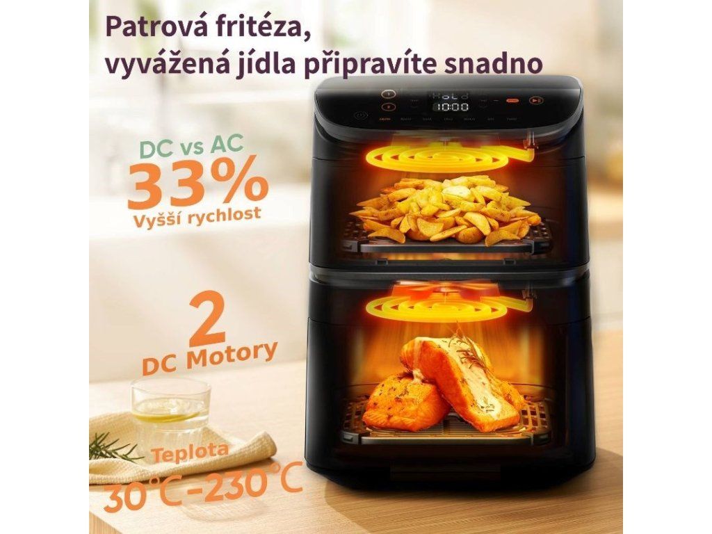 Jedinečný dizajn dvoch košov nad sebou umožňuje pripravovať viacero jedál naraz, oddeliť hlavné jedlo od prílohy a ušetriť miesto na kuchynskej linke. Vďaka pokročilým technológiám Sync and Match môžete pri príprave veľkých porcií ľahko nastaviť rovnaký program pre oba koše alebo koordinovať dokončenie hlavného jedla a prílohy v rovnakom čase. Vďaka technológii Dual Blaze s tromi špirálami, dvomi DC ventilátormi a príkonom 2630 W umožňuje teplovzdušná fritéza maximálne rovnomerné varenie, vďaka čomu nie je potrebné často otáčať alebo pretrepávať pripravené suroviny a zakaždým zabezpečí dokonale zlatisté a chrumkavé jedlo. Vďaka maximálnej teplote 230 °C môžete vo fritéze dokonca grilovať! Vďaka siedmim všestranným funkciám vrátane smaženia, pečenia, grilovania, sušenia alebo kysnutia ide o skutočne multifunkčné zariadenie, ktoré obohatí vašu kuchyňu o nekonečné možnosti varenia.