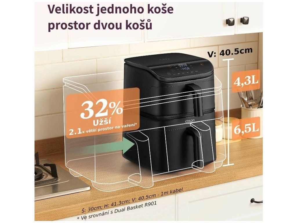 Turbo Tower Pro ponúka riešenie problému s priestorom. Fritéza zaberá minimum miesta, ale ponúka celkový objem takmer 11 litrov. Môžete tak naraz pripraviť obed pre celú rodinu, hromadu hranolčekov na filmový maratón alebo špeciality na večierok. Malý priestor nevadí, Cosori to rieši rozmermi 40,5 x 30 x 41,3 cm (v x š x h).