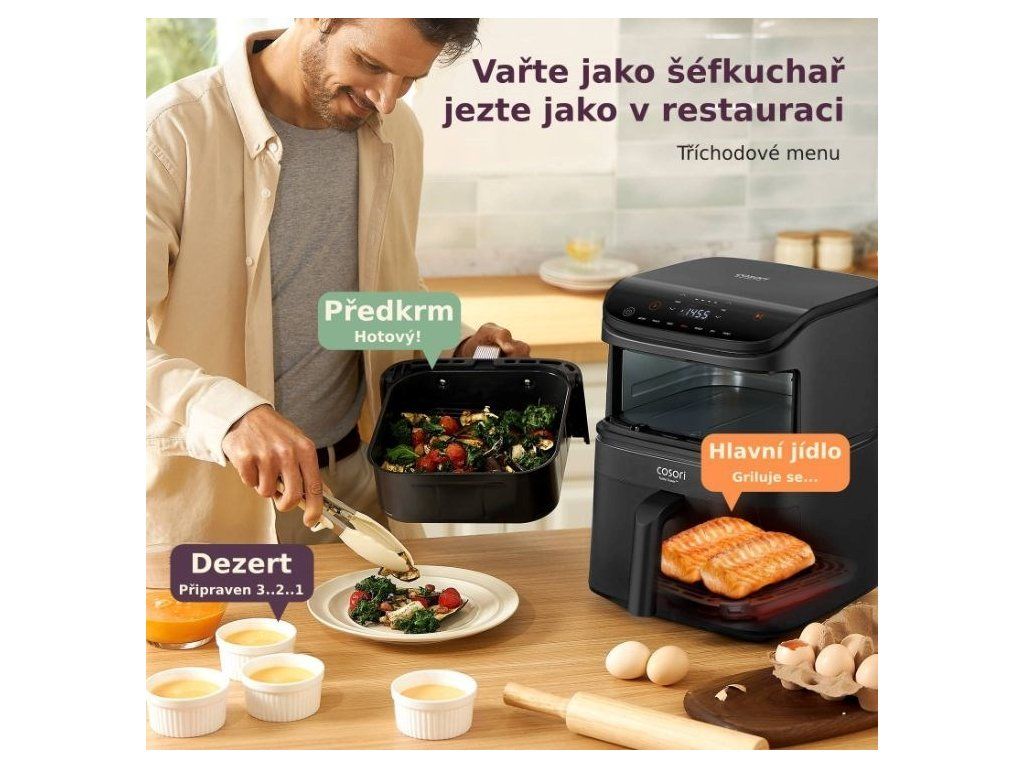 Vďaka siedmim programom dokáže Cosori Turbo Tower piecť, smažiť, grilovať, piecť sladké a slané jedlá, ako aj sušiť a kysnúť. Turbo Tower umožňuje veľmi jednoduchú prípravu zložitých jedál bez toho, aby ste museli neustále vstávať a kontrolovať. Hlavné jedlo a príloha budú hotové v rovnakom čase!