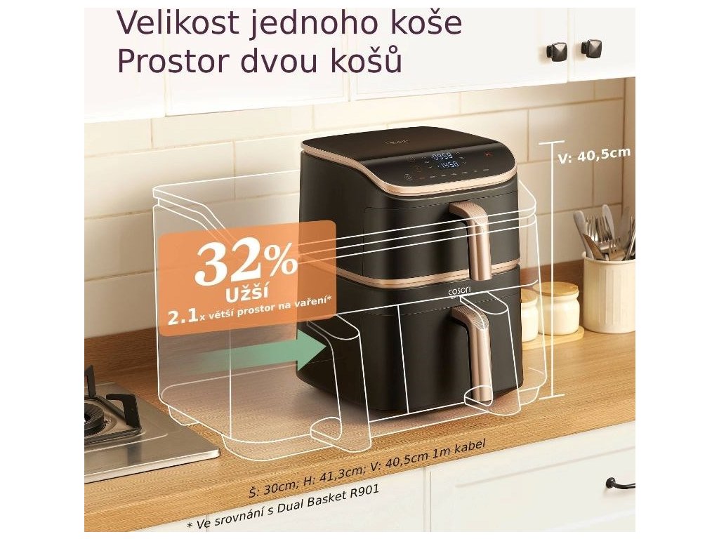 Turbo Tower Pro ponúka riešenie problému s priestorom. Fritéza zaberá minimum miesta, ale ponúka celkový objem takmer 11 litrov. Môžete tak naraz pripraviť obed pre celú rodinu, hromadu hranolčekov na filmový maratón alebo špeciality na večierok. Malý priestor nevadí, Cosori to rieši rozmermi 40,5 x 30 x 41,3 cm (v x š x h).