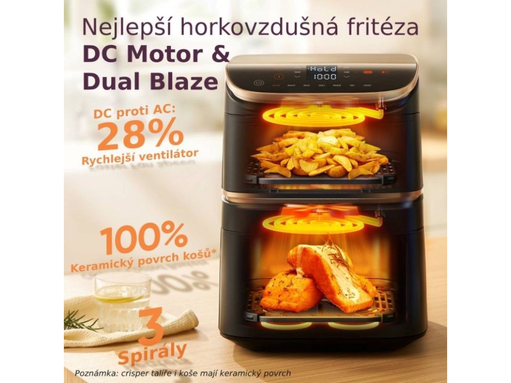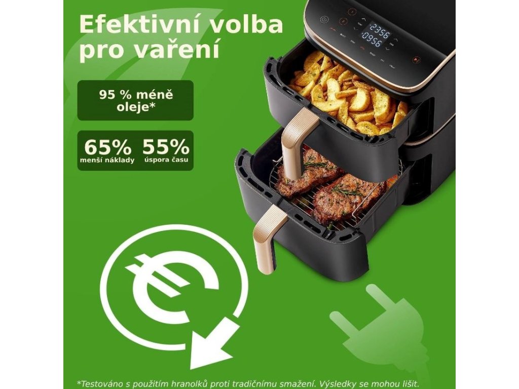 Jedinečná konštrukcia dvoch košov nad sebou umožňuje pripravovať viacero jedál naraz, oddeliť hlavné jedlo od prílohy a ušetriť miesto na kuchynskej linke. Vďaka pokročilým technológiám Sync a Match môžete pri príprave veľkých porcií ľahko nastaviť rovnaký program pre oba koše alebo skoordinovať dokončovanie hlavného jedla a prílohy na rovnaký čas. Vďaka technológii Dual Blaze s tromi špirálami, dvomi ventilátormi na jednosmerný prúd a príkonom 2630 W umožňuje teplovzdušná fritéza maximálne rovnomerné varenie, vďaka čomu nie je potrebné často otáčať alebo pretrepávať pripravené suroviny a zakaždým zabezpečí dokonale zlatisté a chrumkavé jedlo. Vďaka maximálnej teplote 230 °C môžete vo fritéze dokonca grilovať!