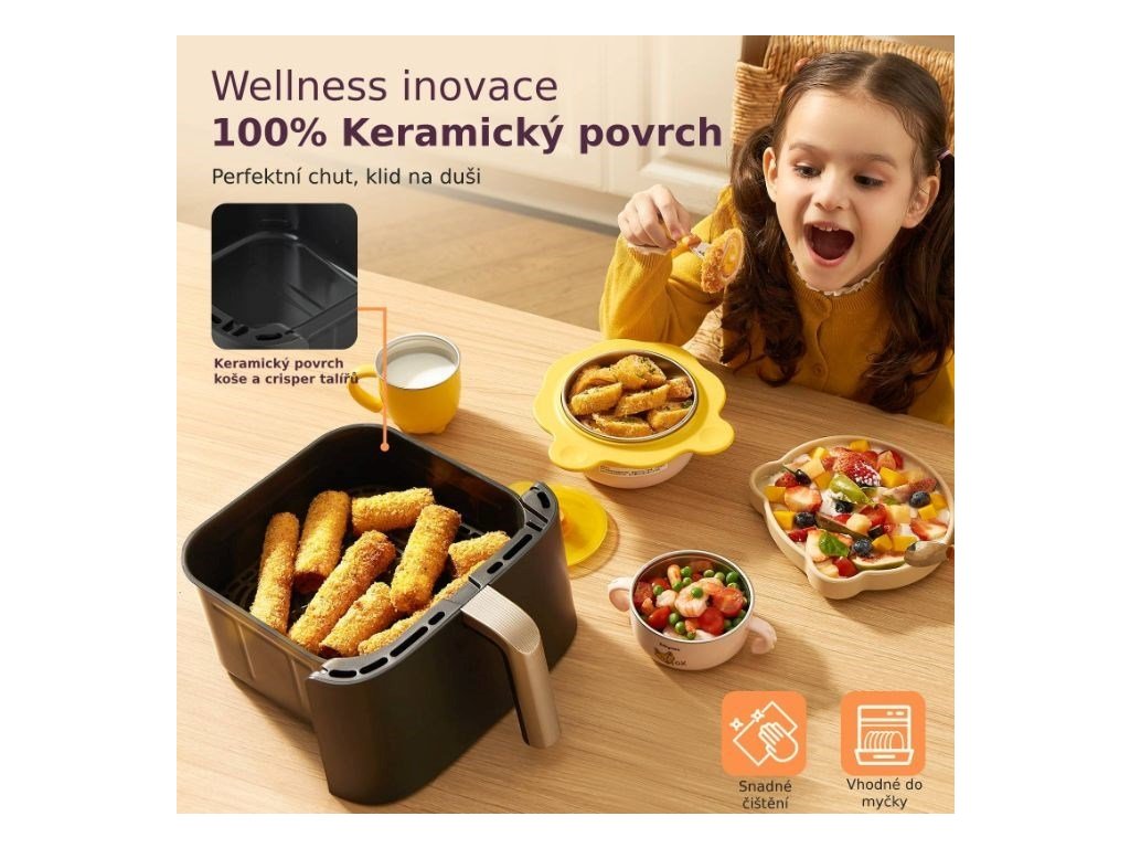 Zdravé varenie teraz nadobúda úplne nový význam. Vďaka keramickému povrchu košov a až o 95 % nižšej spotrebe oleja si môžete vychutnať vyprážané jedlo oveľa zdravšie a predovšetkým chutnejšie. Integrácia inteligentnej aplikácie vám umožňuje ovládať teplovzdušnú fritézu na diaľku, vďaka čomu máte prístup k tisícom receptov a priebežnému stavu prípravy, čo vám uľahčí prípravu zdravých a chutných jedál. Vďaka siedmim všestranným funkciám vrátane fritovania, pečenia, grilovania, sušenia alebo kysnutia ide o skutočne multifunkčné zariadenie, ktoré obohatí vašu kuchyňu o nekonečné možnosti varenia. Vďaka pripojeniu Wi-Fi môžete fritézu dokonca ovládať a monitorovať na diaľku a pomocou aplikácie máte prístup k receptom a výživovým tipom.