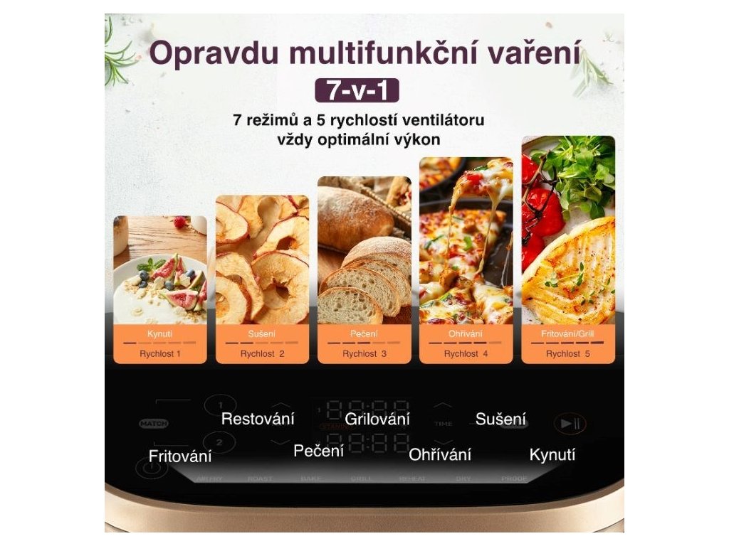 - Programy: Air Fry (fritovanie horúcim vzduchom), Restovanie, Grilovanie, Pečenie, Ohrievanie, Sušenie, Kysnutie