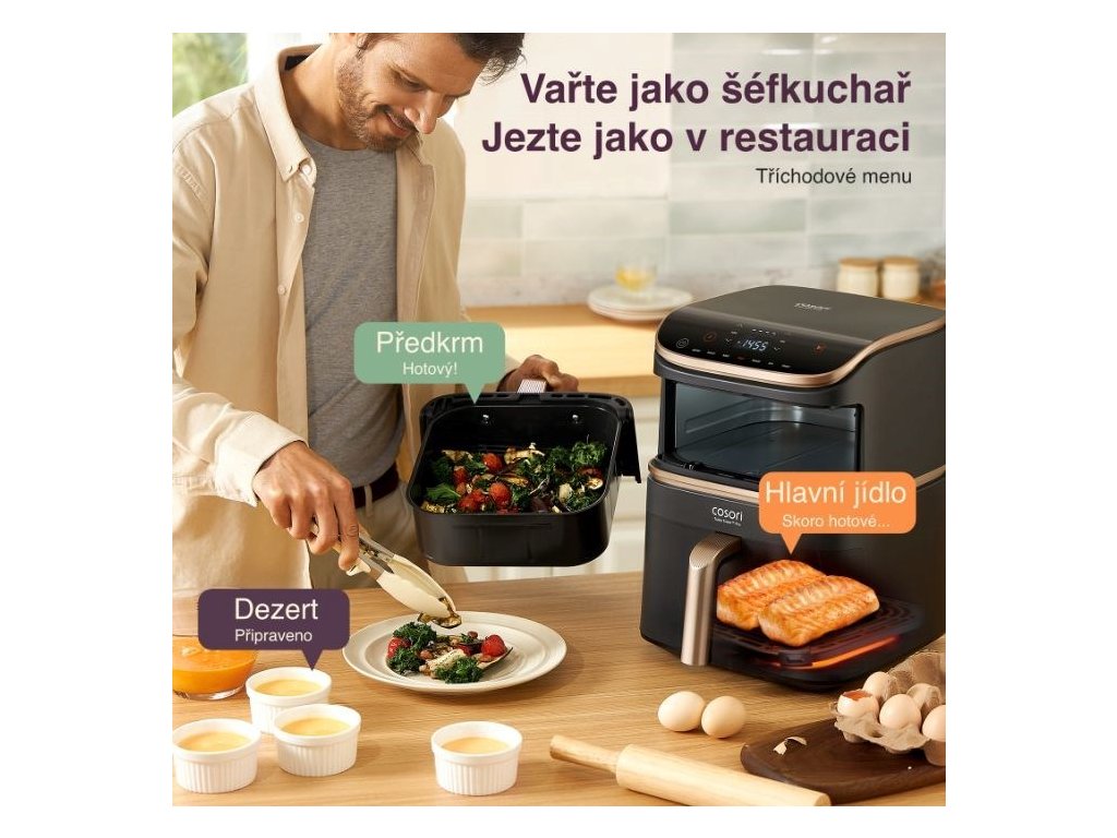 Vďaka siedmim programom dokáže Cosori Turbo Tower Pro piecť, smažiť, grilovať, piecť sladké aj slané, a dokonca aj sušiť a kysnúť. A to nie je všetko, jeho funkcie vám pomôžu variť tak, aby hlavné jedlo a príloha boli hotové v rovnakom čase a vy ste sa mohli v pokoji dostať k stolu. A kým skončíte, budete mať hotový aj dezert. Nechajte sa rozmaznávať a netúlajte sa od kuchyne k stolu.