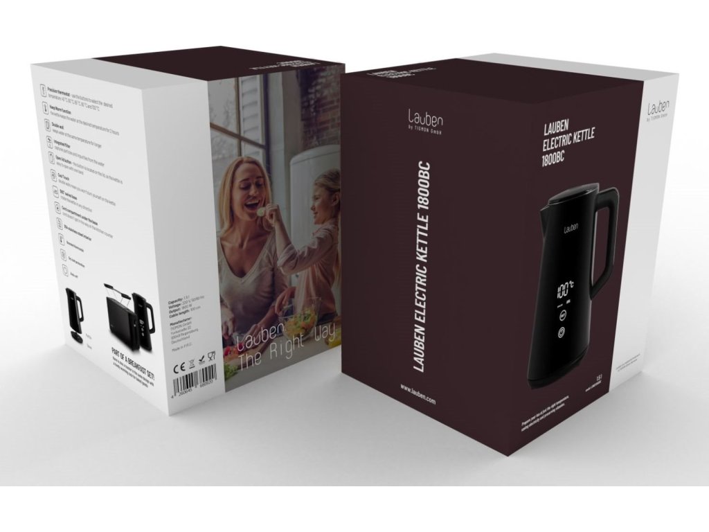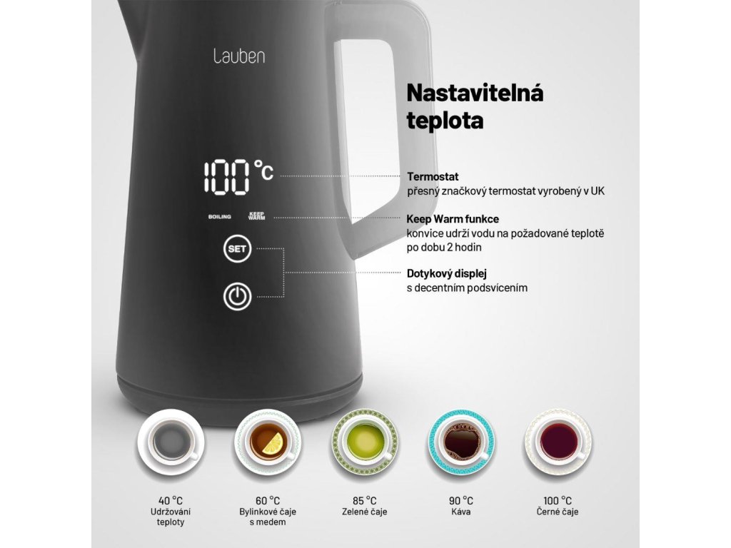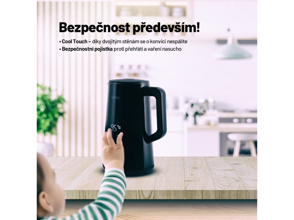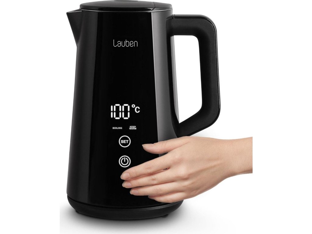 Voda presne na mieru nápojomNepostrádateľnou súčasťou kuchýň sa stala rýchlovarná kanvica. Aj tá však môže byť viac než len užitočný domáci spotrebič. Lauben Elektrická Rýchlovarná Kanvica 1800BC v dokonalom čiernom dizajne s veľkým digitálnym displejom je veľmi praktická a zároveň pôsobí ako štýlový dizajnový doplnok. Vodu v nej ohrievate presne na požadovanú teplotu a vďaka presnému termostatu a funkcii Keep Warm ju udrží na rovnaké teplote až po dobu 2 hodín. Ani potom jej dvojité steny nedovolia rýchlo ochladiť. Údržba kanvice je jednoduchšia než kedykoľvek predtým, integrovaný filter zachytí mnoho nečistôt. Ako vždy myslíme aj na bezpečnosť, preto technológia Cool Touch zabraňuje popáleniu pri kontakte s kanvicou a bezpečnostná poistka prístroj ochráni proti prehriatiu a vareniu bez vody. Samozrejmosťou je základňa otočná o 360° s priestorom na ukrytie kábla.