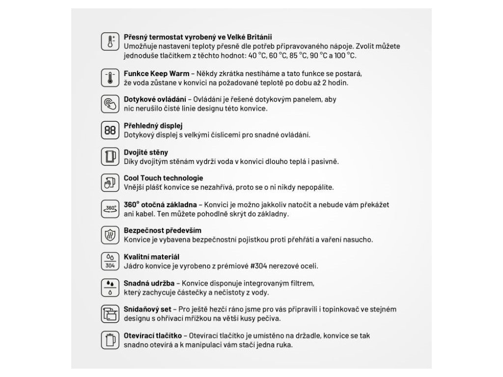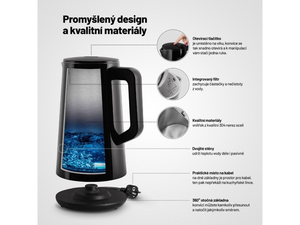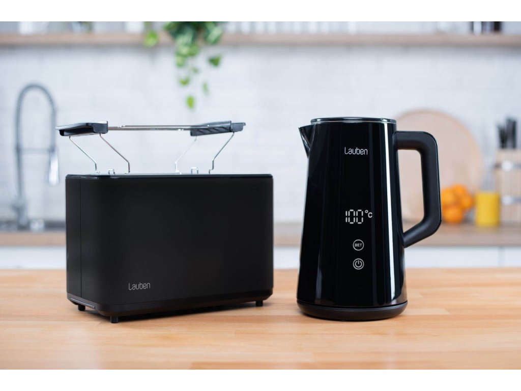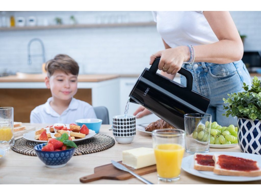 Voda presne na mieru nápojomNepostrádateľnou súčasťou kuchýň sa stala rýchlovarná kanvica. Aj tá však môže byť viac než len užitočný domáci spotrebič. Lauben Elektrická Rýchlovarná Kanvica 1800BC v dokonalom čiernom dizajne s veľkým digitálnym displejom je veľmi praktická a zároveň pôsobí ako štýlový dizajnový doplnok. Vodu v nej ohrievate presne na požadovanú teplotu a vďaka presnému termostatu a funkcii Keep Warm ju udrží na rovnaké teplote až po dobu 2 hodín. Ani potom jej dvojité steny nedovolia rýchlo ochladiť. Údržba kanvice je jednoduchšia než kedykoľvek predtým, integrovaný filter zachytí mnoho nečistôt. Ako vždy myslíme aj na bezpečnosť, preto technológia Cool Touch zabraňuje popáleniu pri kontakte s kanvicou a bezpečnostná poistka prístroj ochráni proti prehriatiu a vareniu bez vody. Samozrejmosťou je základňa otočná o 360° s priestorom na ukrytie kábla.