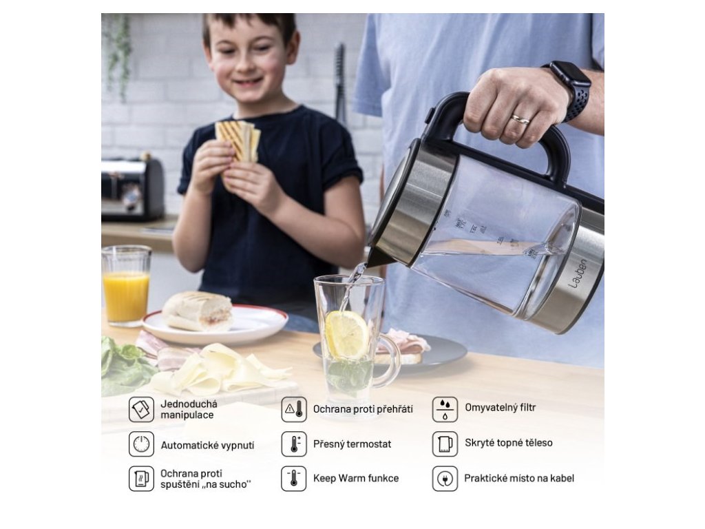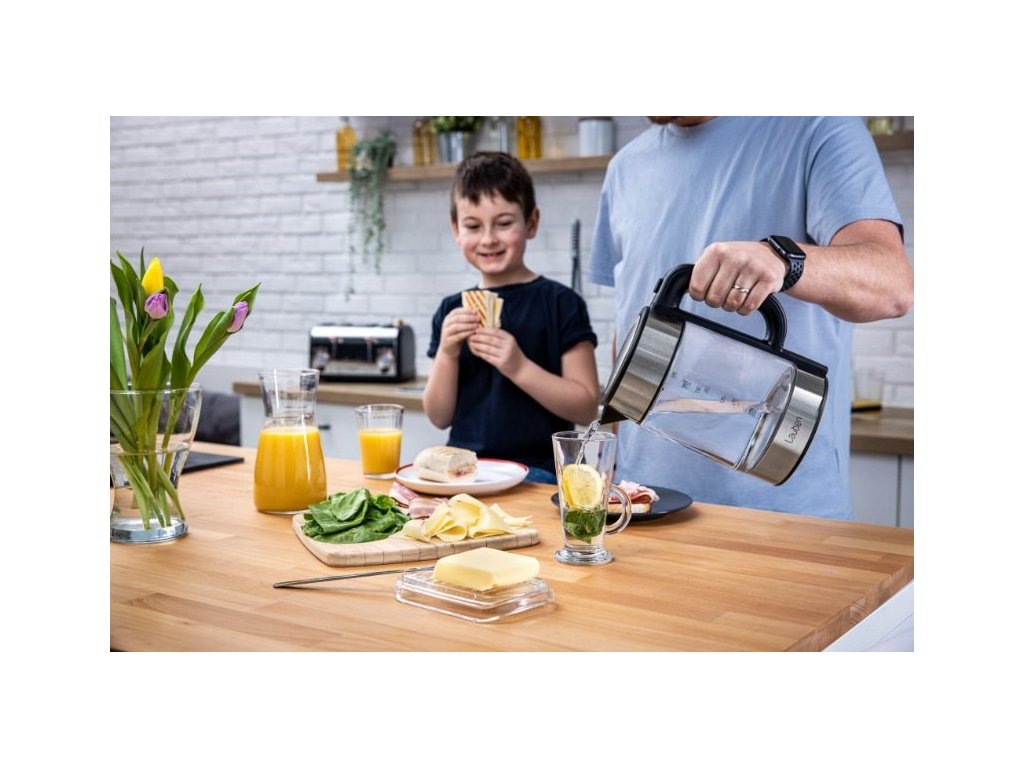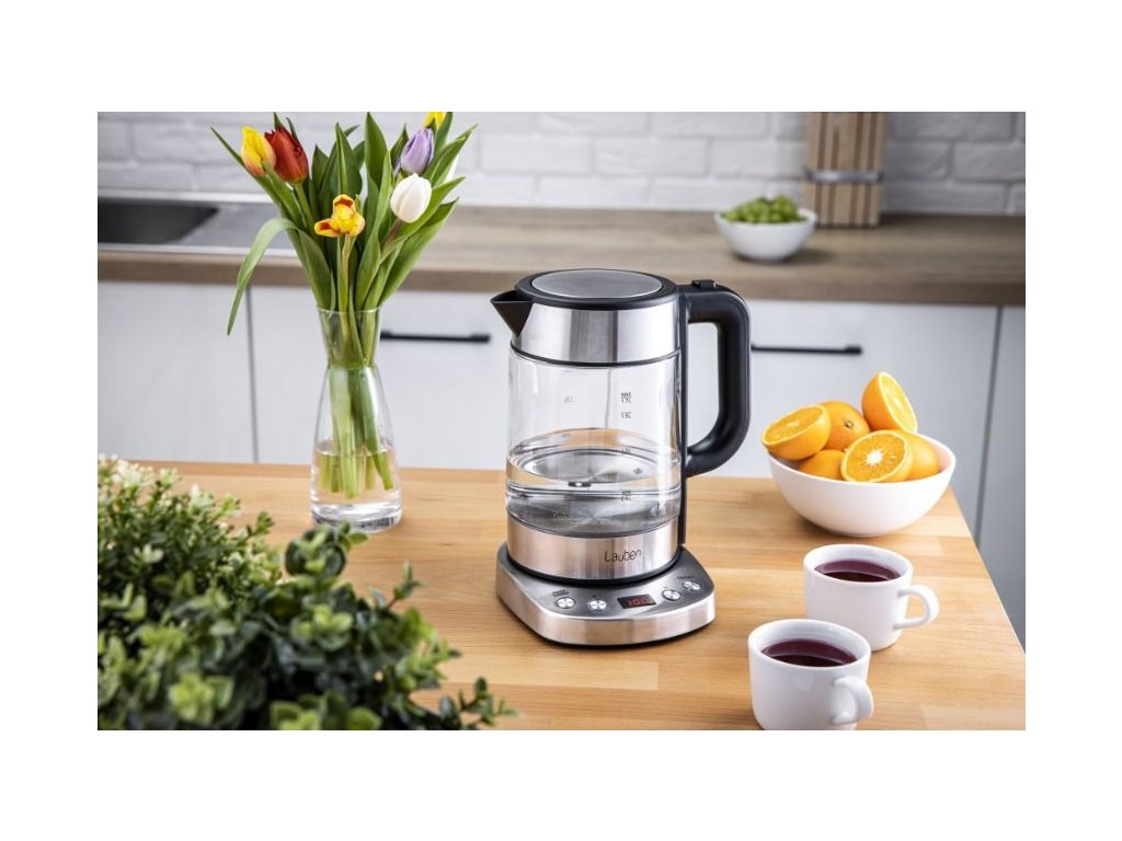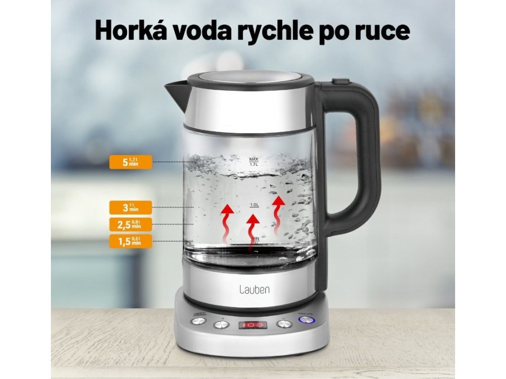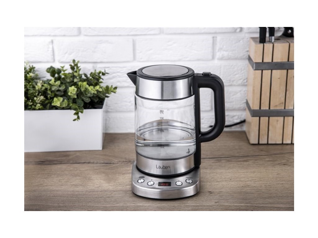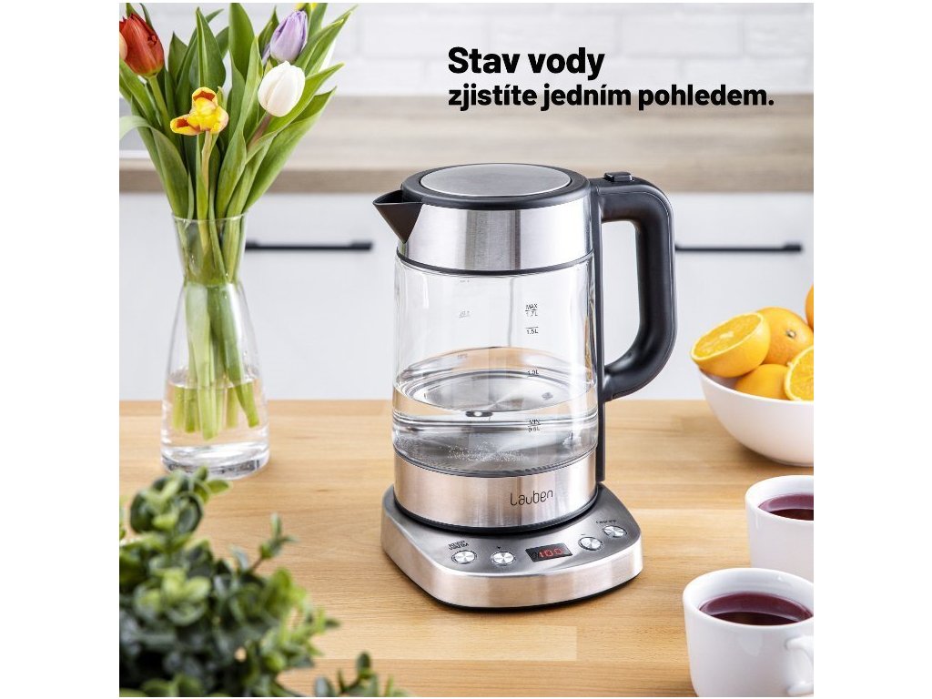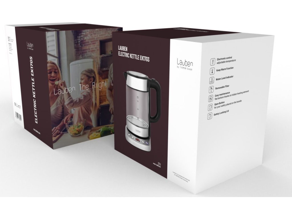 Teplotu volíte v rozmedzí 60-100 °C po desiatich stupňových intervaloch. V konvici Lauben ohrejete až 1,7 l vody naraz. Jej aktuálne množstvo vždy poznáte vďaka stupnici na skle. Veko konvice je vybavené bezpečnostnou poistkou proti rozliatiu a otvárate ho jednoducho, pomocou tlačidla umiestneného na držadle.