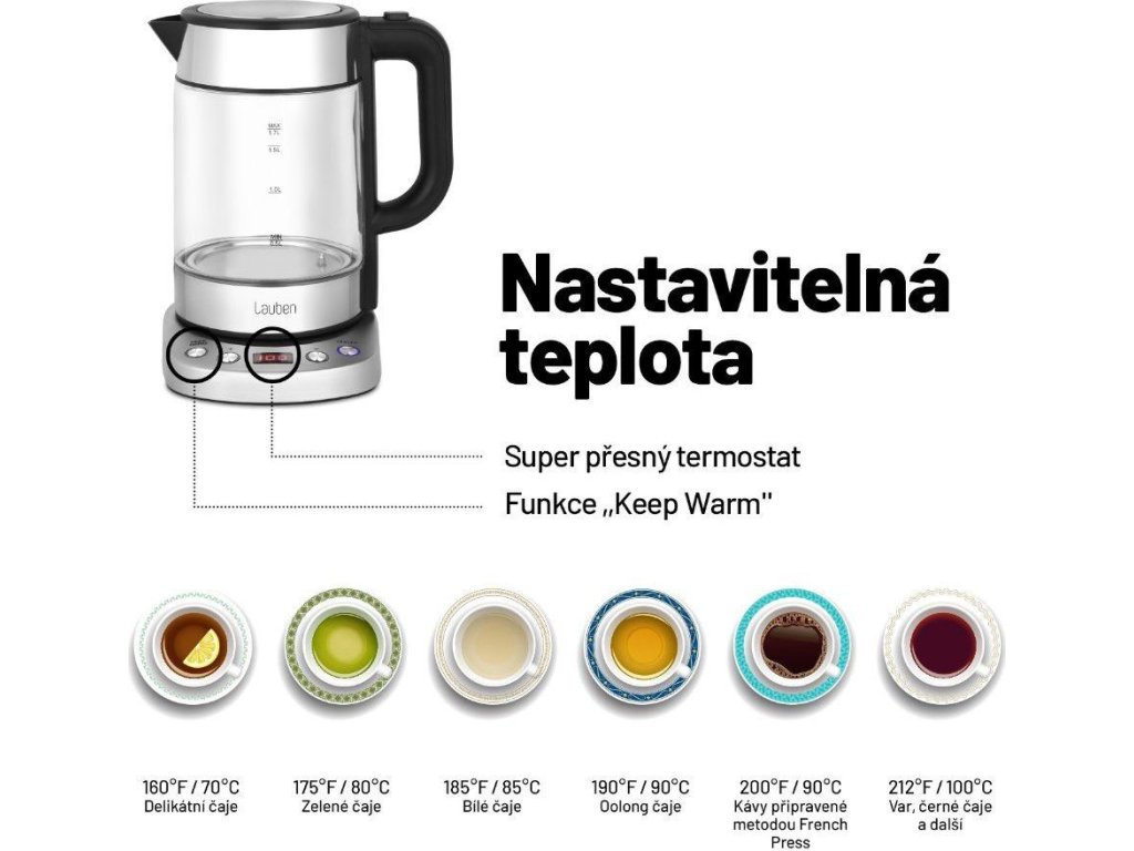Teplota presne, ako má byťLauben Electric Kettle EK17GS je dizajnová rýchlovarná konvica s nastaviteľnou teplotou ohrevu vody a Keep Warm funkciou. Možnosť nastavenia teploty vody v kuchyni určite oceníte. Potrebujete zalejeť zelený čaj? Už nikdy nemusíte čakať, až voda vychladne, stačí si preferovanú teplotu zvoliť na prehľadnom LCD displeji.
