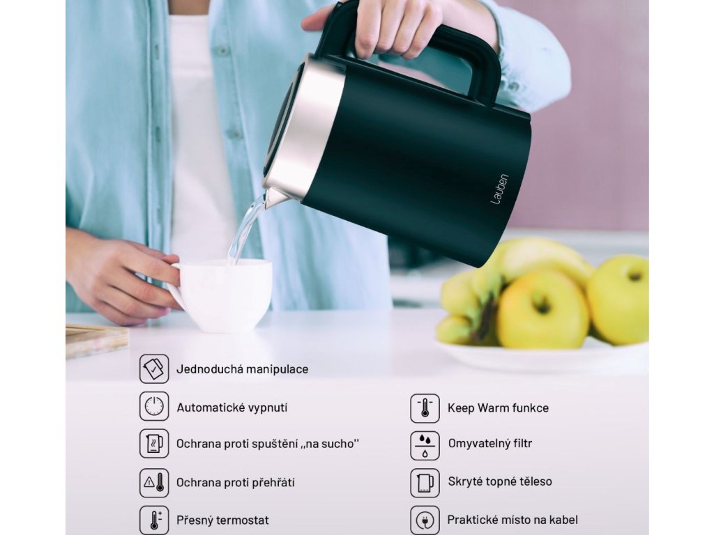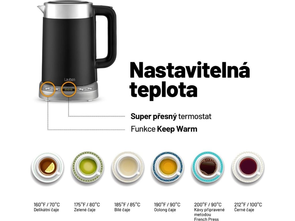 Lauben Elektrická Kanvica EK17SB je dizajnová rýchlovarná kanvica s nastaviteľnou teplotou ohrevu vody a Keep Warm funkciou. Možnosť nastavenia teploty vody v kuchyni určite oceníte. Potrebujete zalievať zelený čaj? Už nikdy nemusíte čakať, až voda vychladne, stačí si vybrať preferovanú teplotu na prehľadnom LCD displeji.