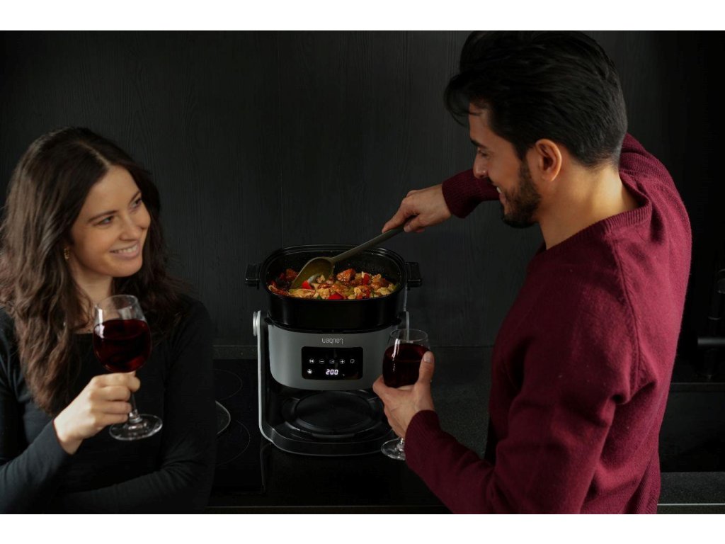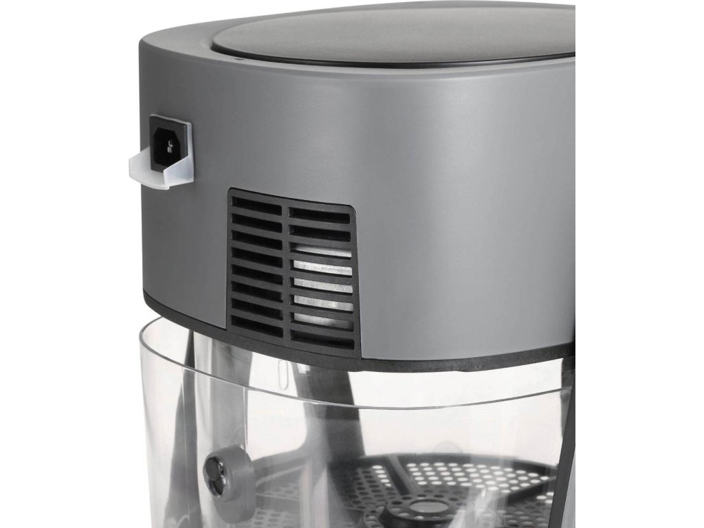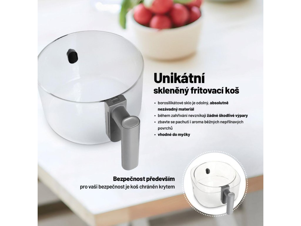 Prehľadným digitálnym displejom si intuitívne zvolíte niektorý zo 6 prednastavených programov na fritovanie hranoliek, mäsa či grilovanie - Fries, Steak, Fish, Shrimps, Pizza, Grill Mode. Čas aj teplotu si však nastavíte aj manuálne podľa potreby. Vďaka unikátnej sklenenej mise s viditeľnosťou 360° a vnútornému osvetleniu máte stále prehľad o priebehu prípravy jedla. Použitý materiál navyše nezanecháva žiadnu pachť či zápach v jedle.